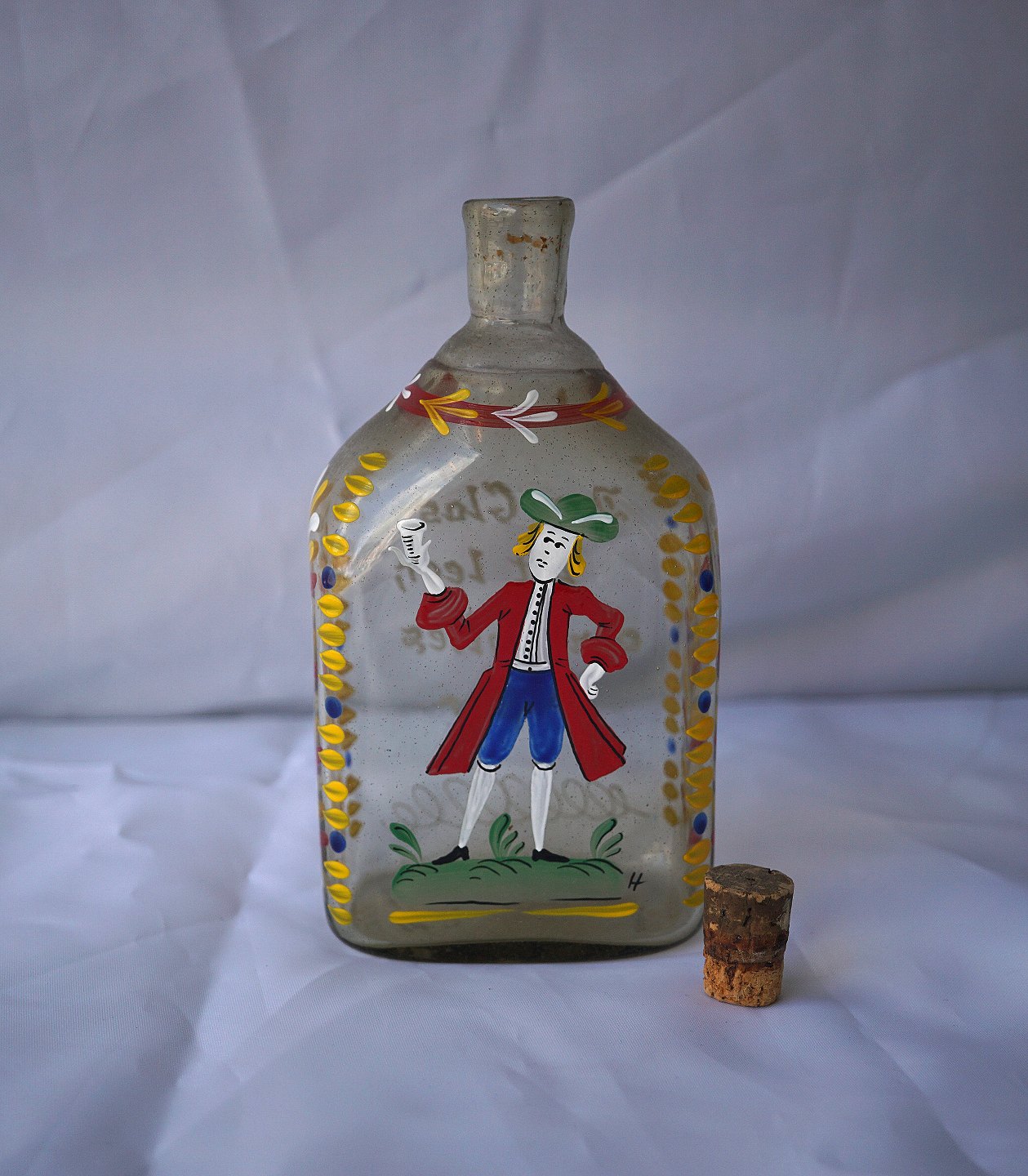 Lille antik bemalet flaske, med et tysk digt på bagsiden. Forsiden viser en herre med et glas i hånden, flasken har korkprop.