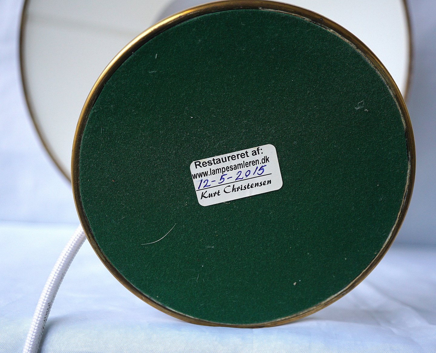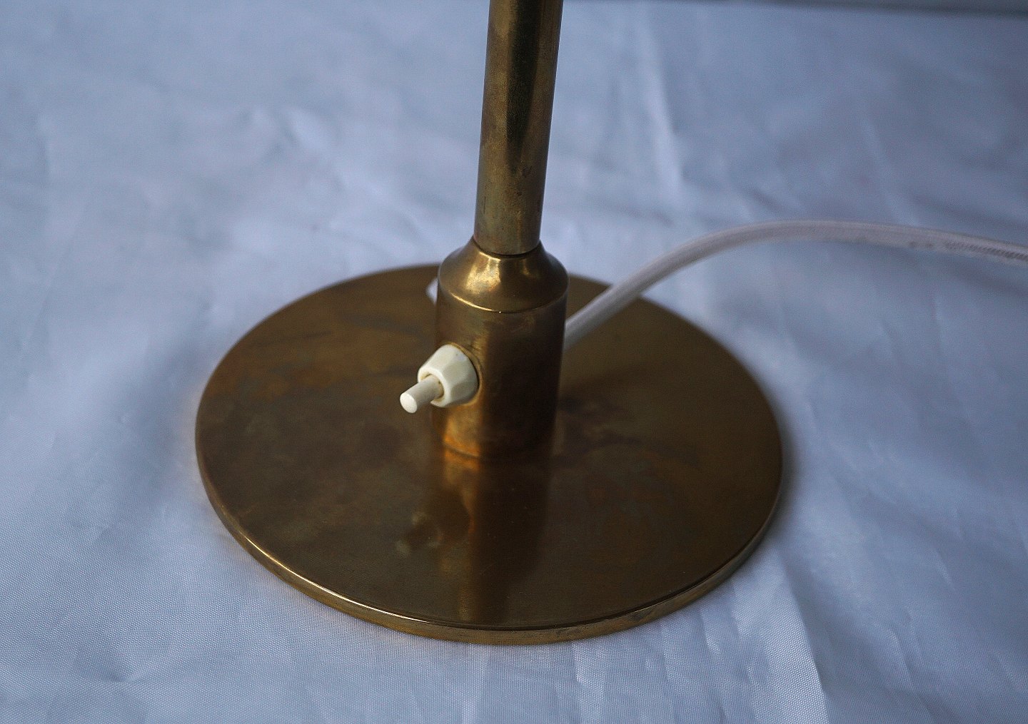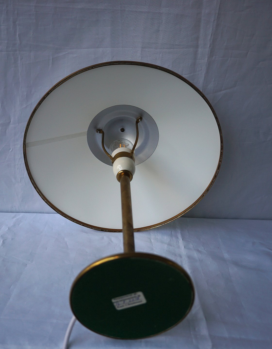 Kongelys Messing bordlampe med hvid plastskærm. Lampen er monteret med sort plastledning, gamle udgave med trykknap ved fod.