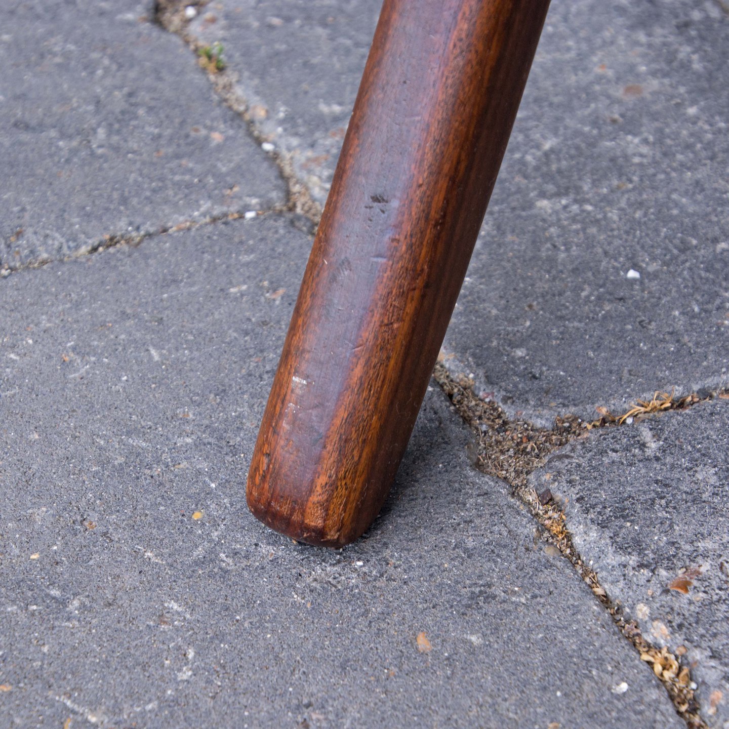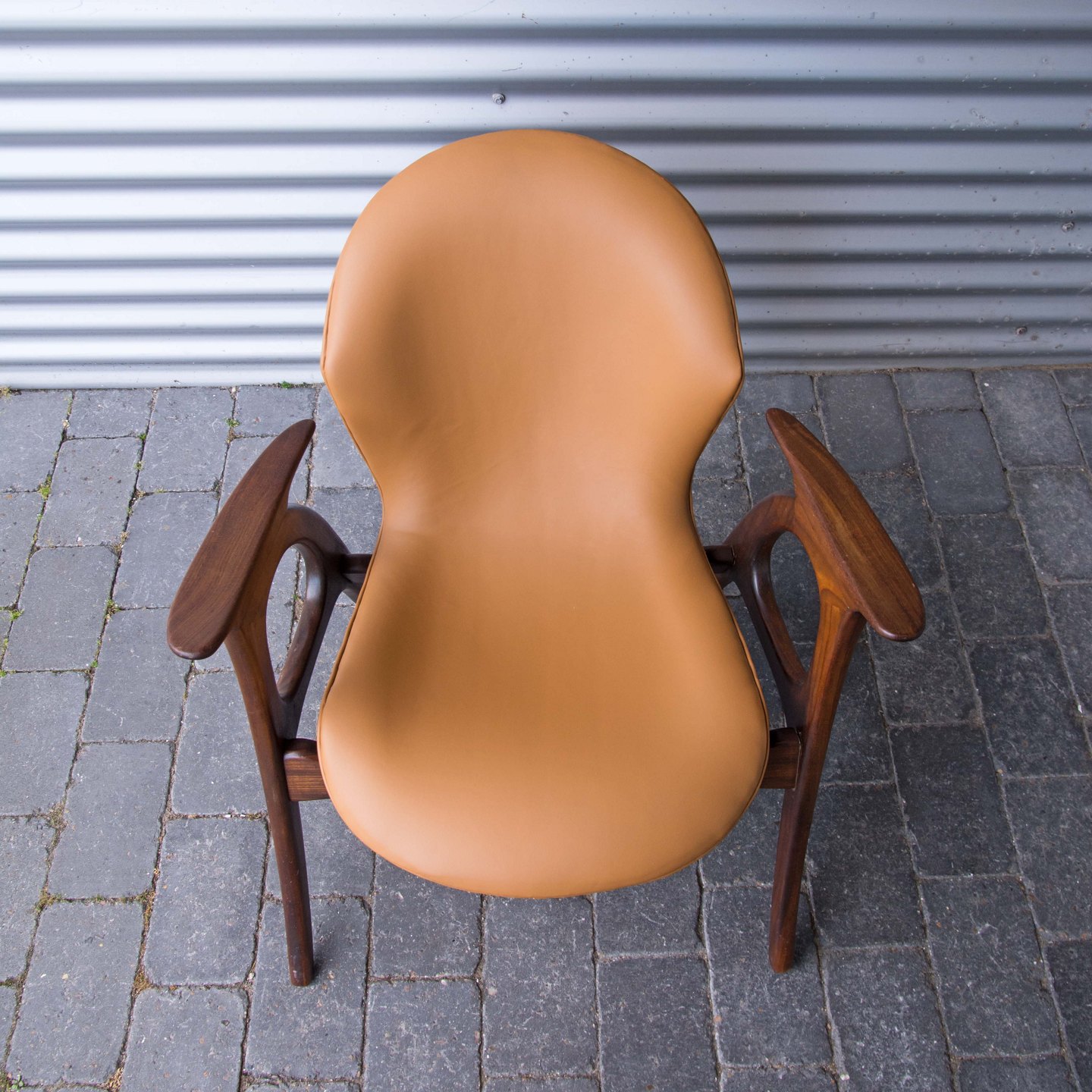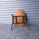 Lænestol i teaktræ med hjemmepolstret sæde i lyst nappa, der er hjemmepolstret.