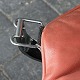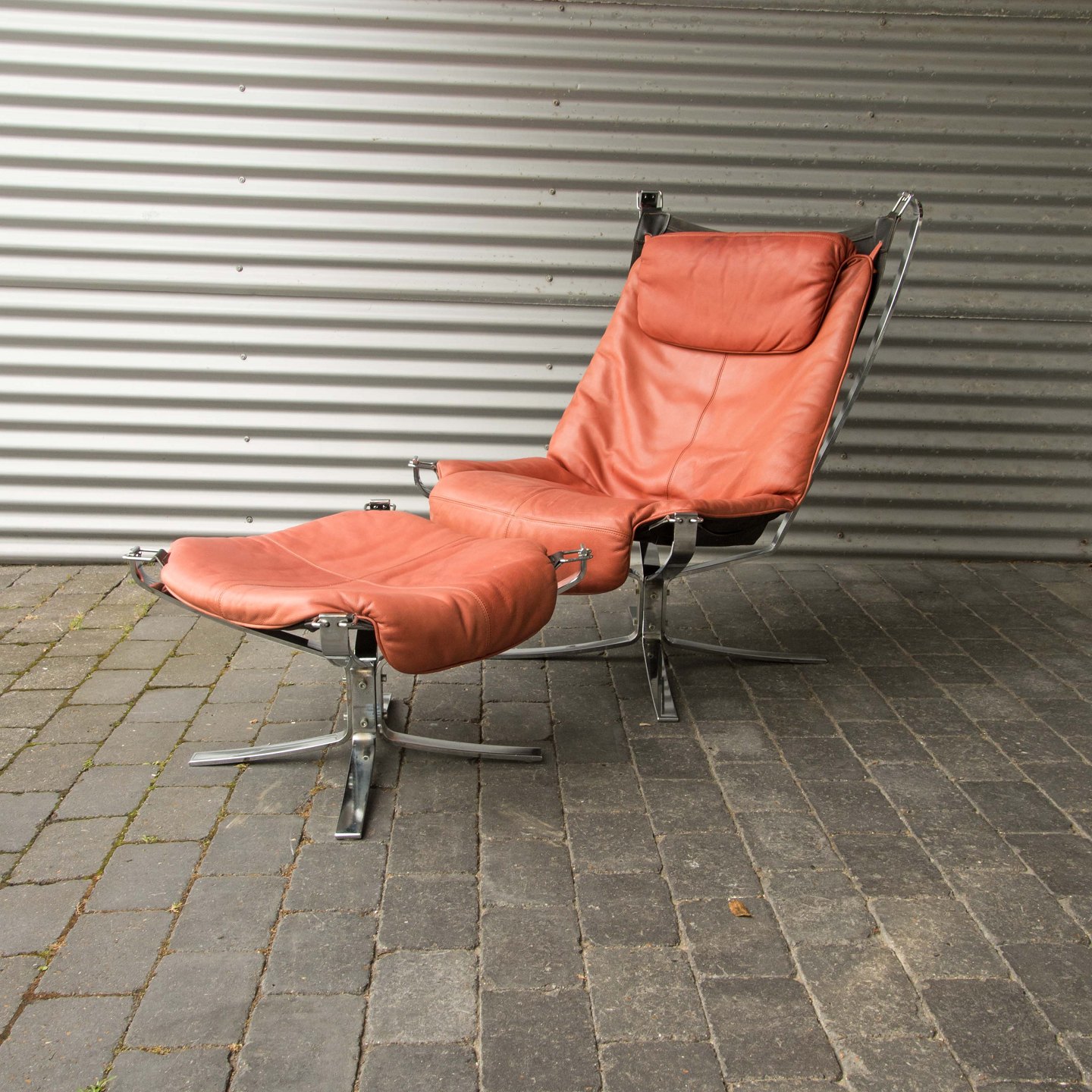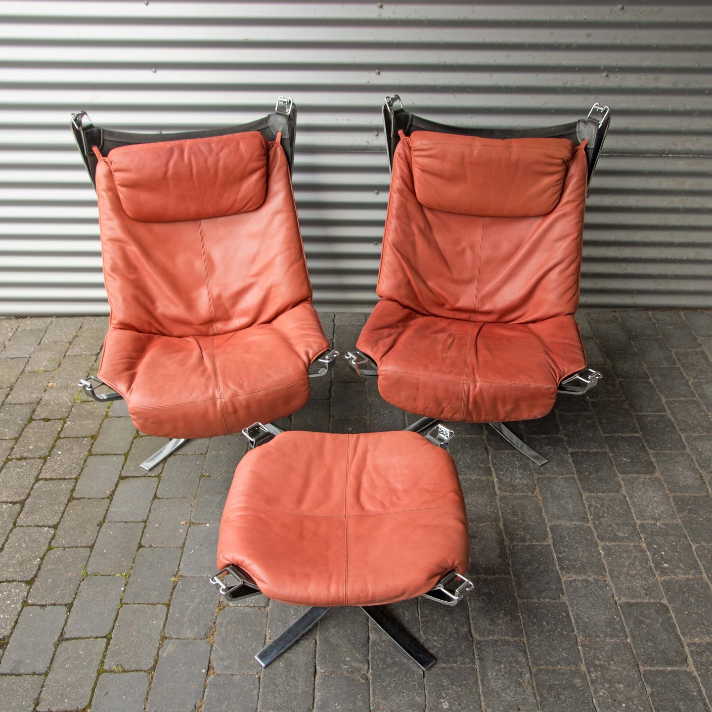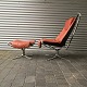 Et sæt højrygget lænestole med skammel i forkromet stål og rødt læder model Falcon.