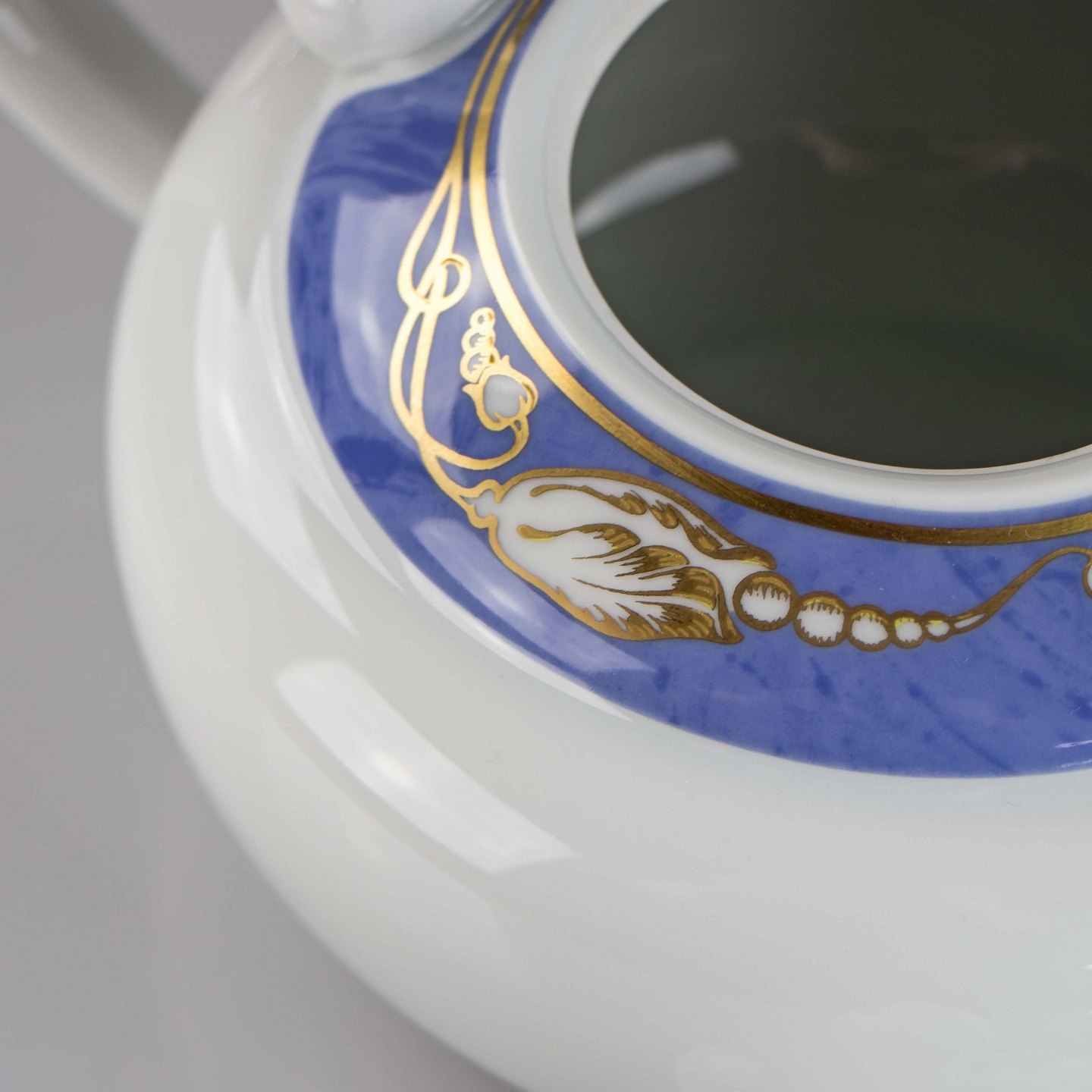 Tepotte med lyseblå marmoret bort dekoreret med gylden blomsterknop.
