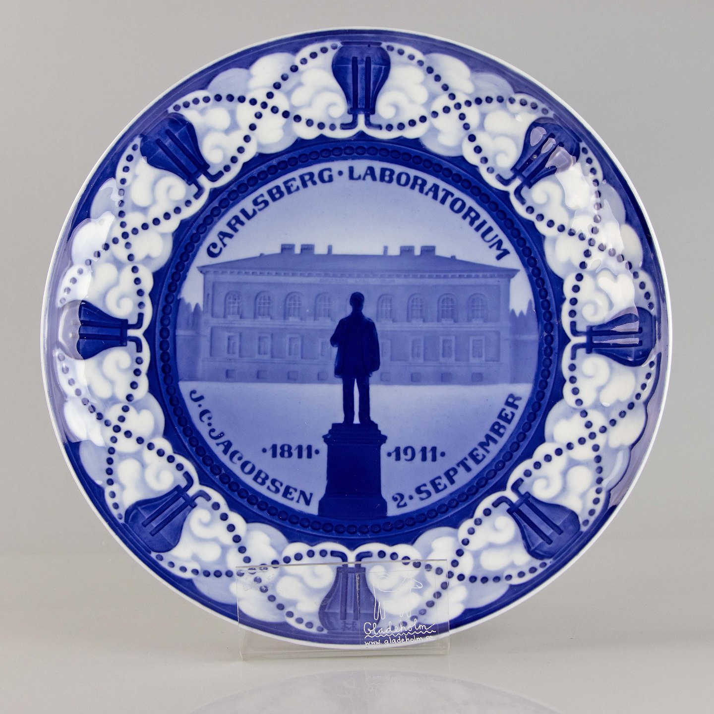 Mindeplatte i porcelæn med teksten Carlsberg Laboratorium år 1811-1911. J.C. Jacobsen 2. september nr. 1274