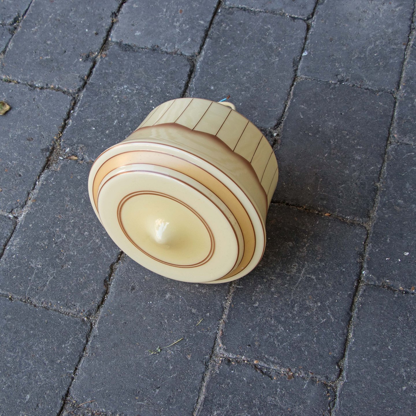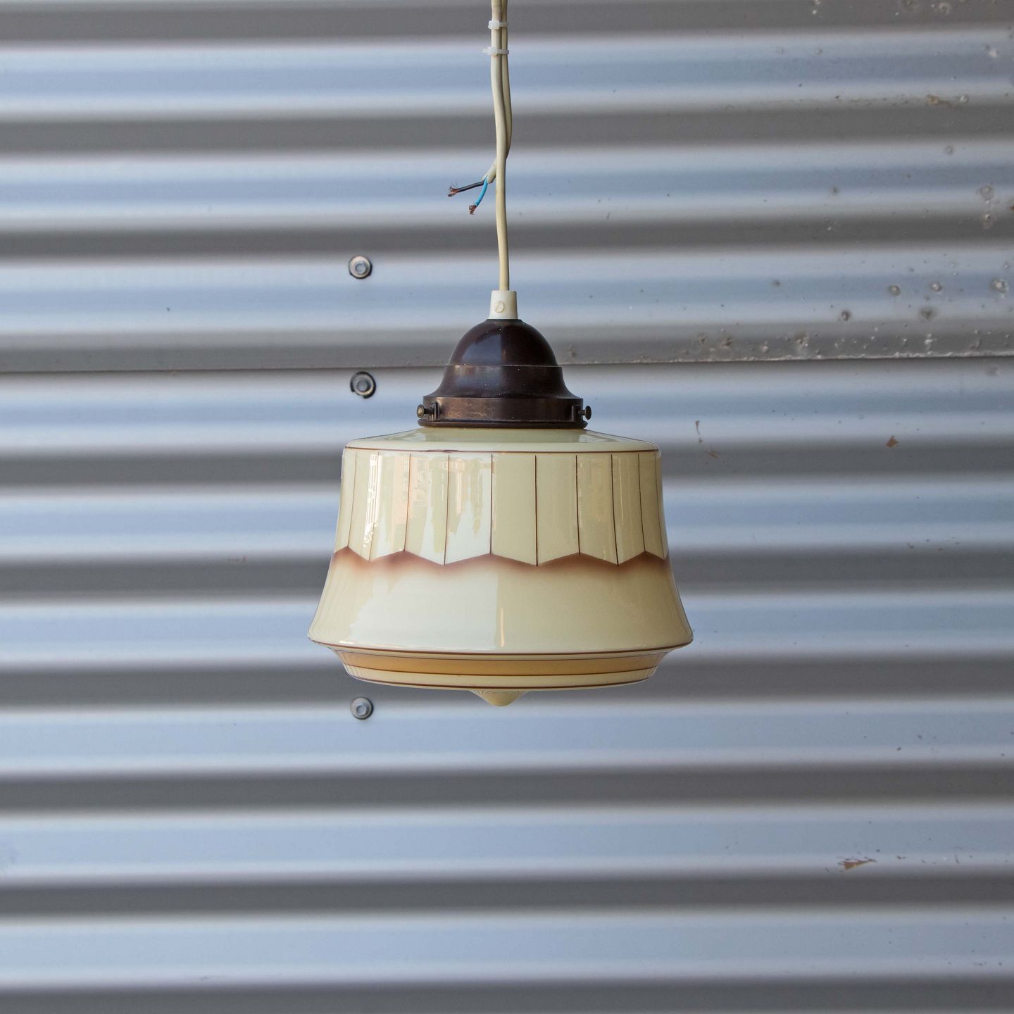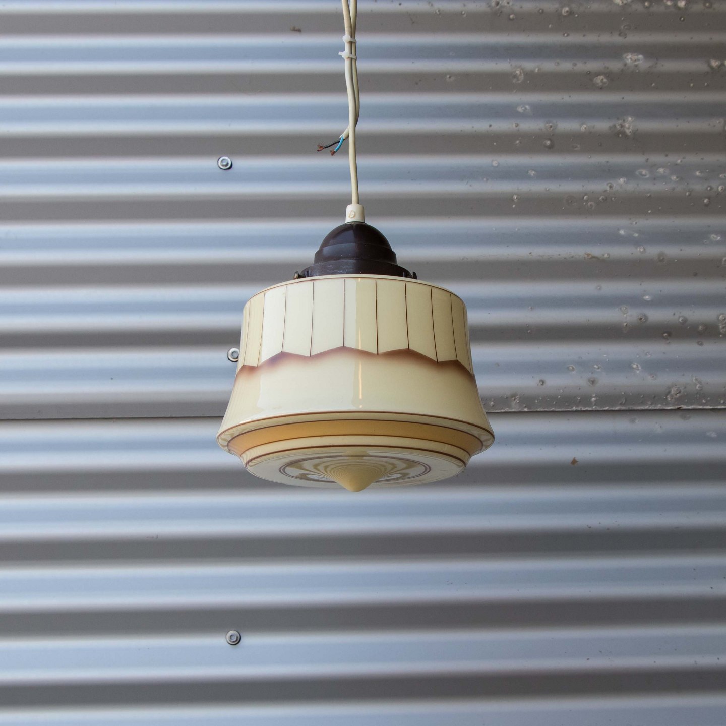 Pendel i glas i gyldne nuancer med brunt mønster .