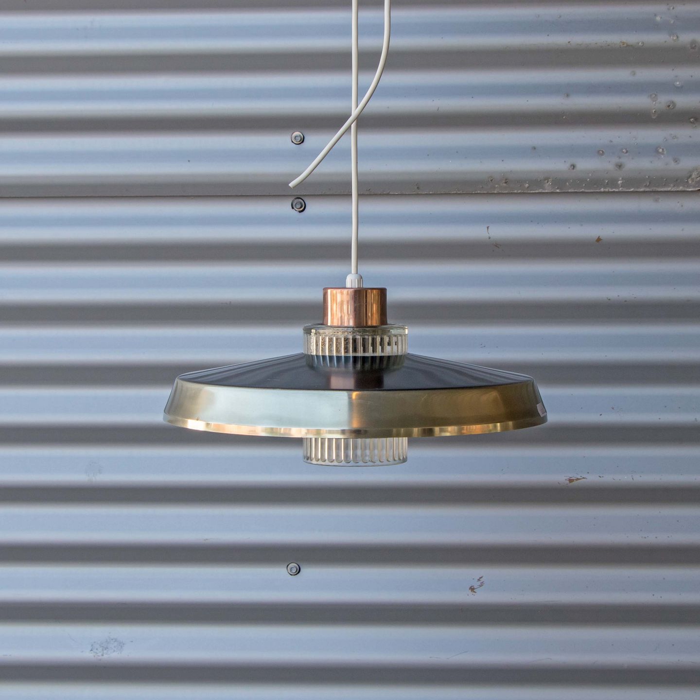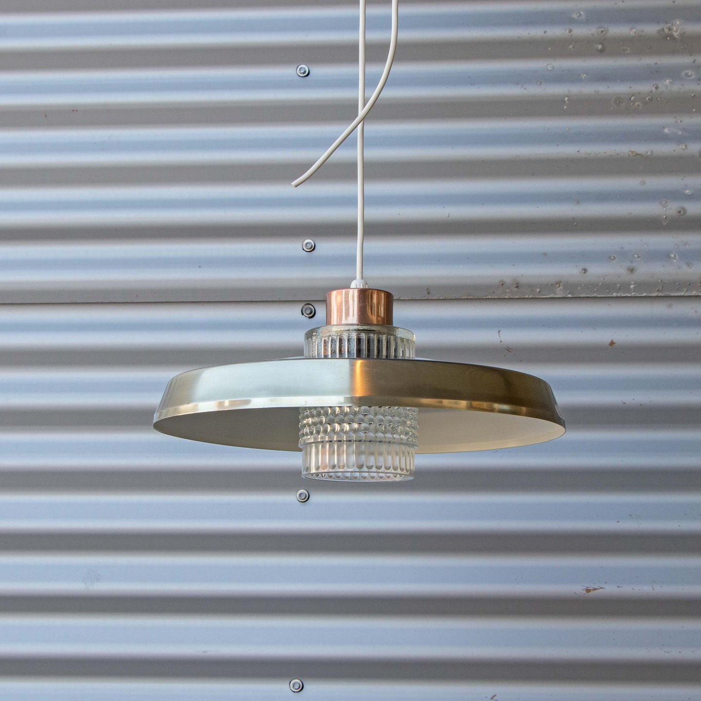 Lampen har udover skærm i aluminium også en underskærm i klart presset glas samt lys kobberfarvet metal top.