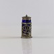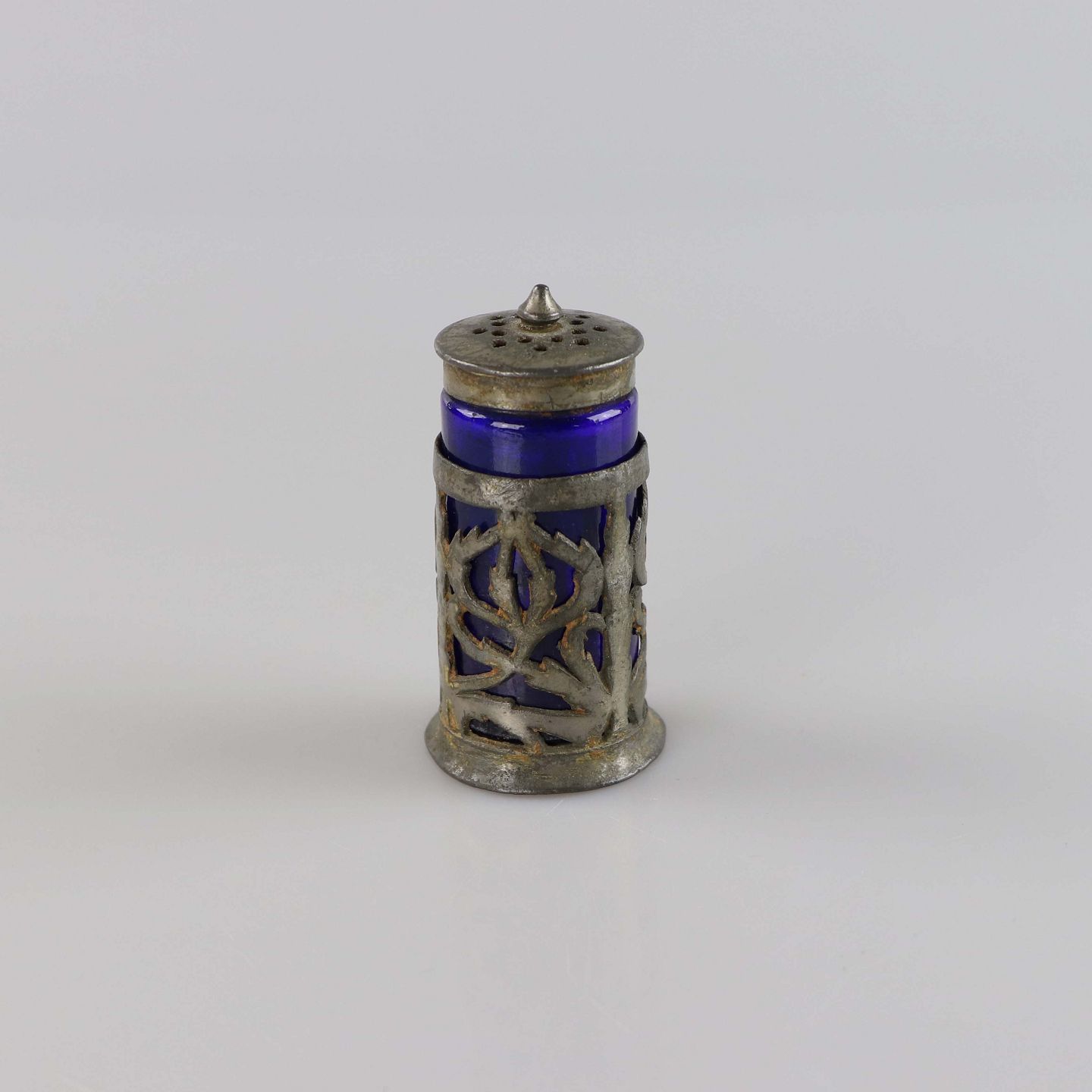 Saltbøsse med blå glas beholder med låg og holder i metal