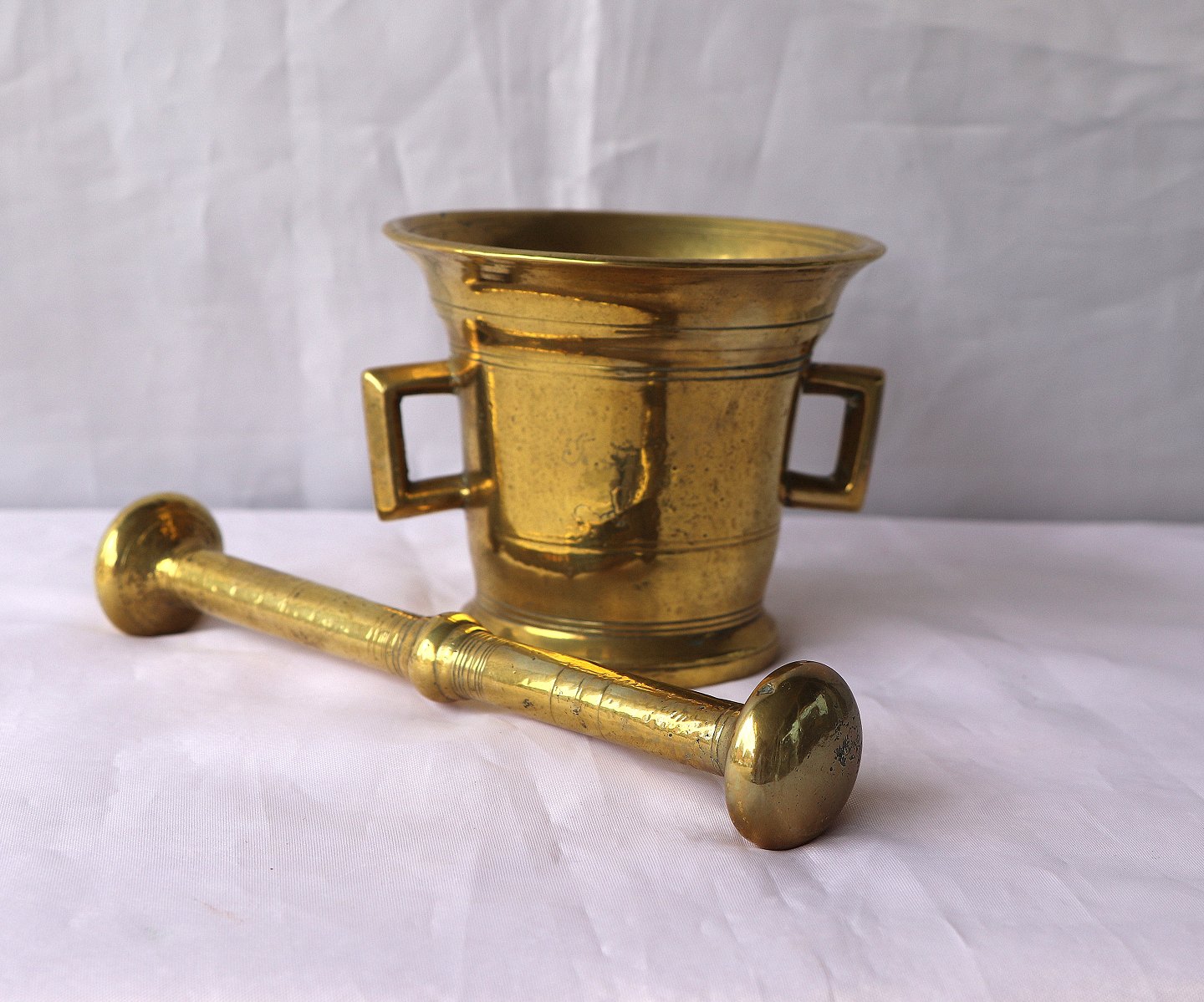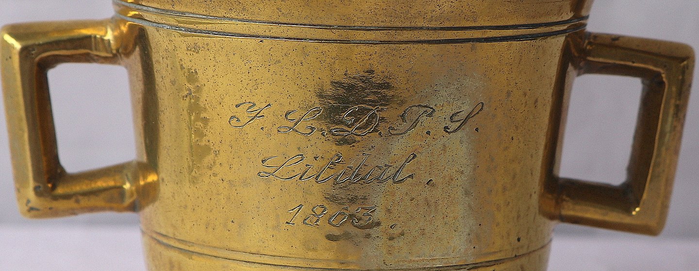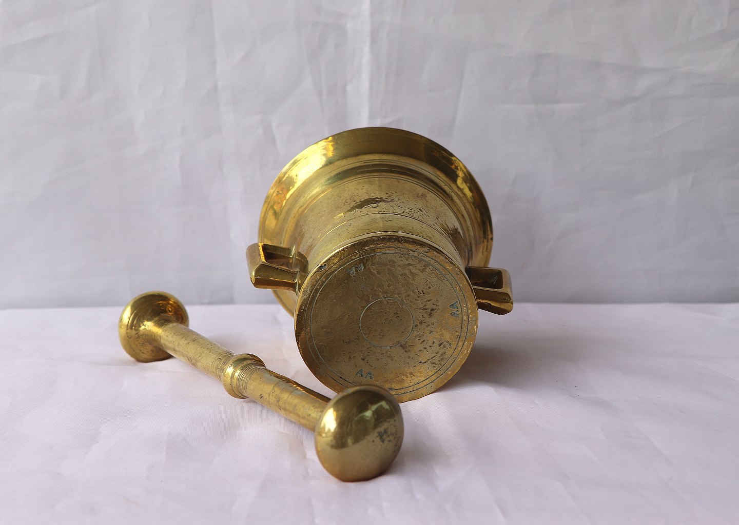 Morter & støder af messing. Der er graveret forskellige bogstaver + årstal (1863) på front af morteren. I bunden er der stemplet AA 3 gange.
