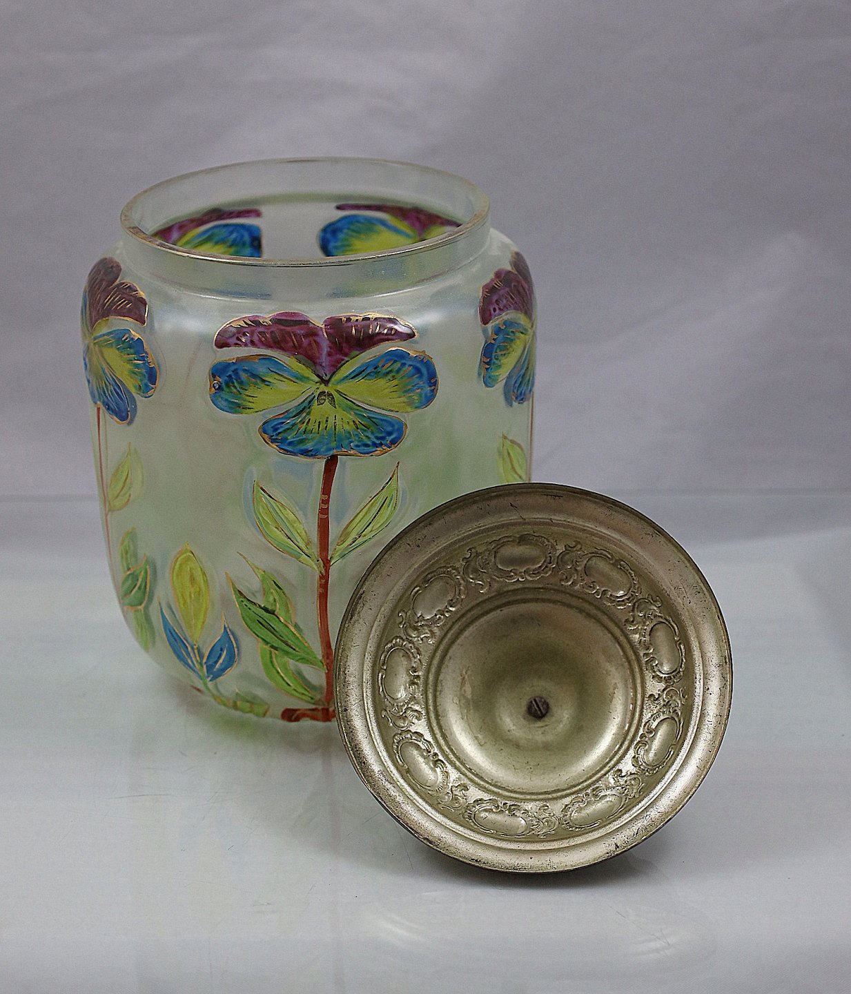 Kiksespand, med låg, i klart glas. Mønstret er præget i glasset og malet. Låget er af metal.
