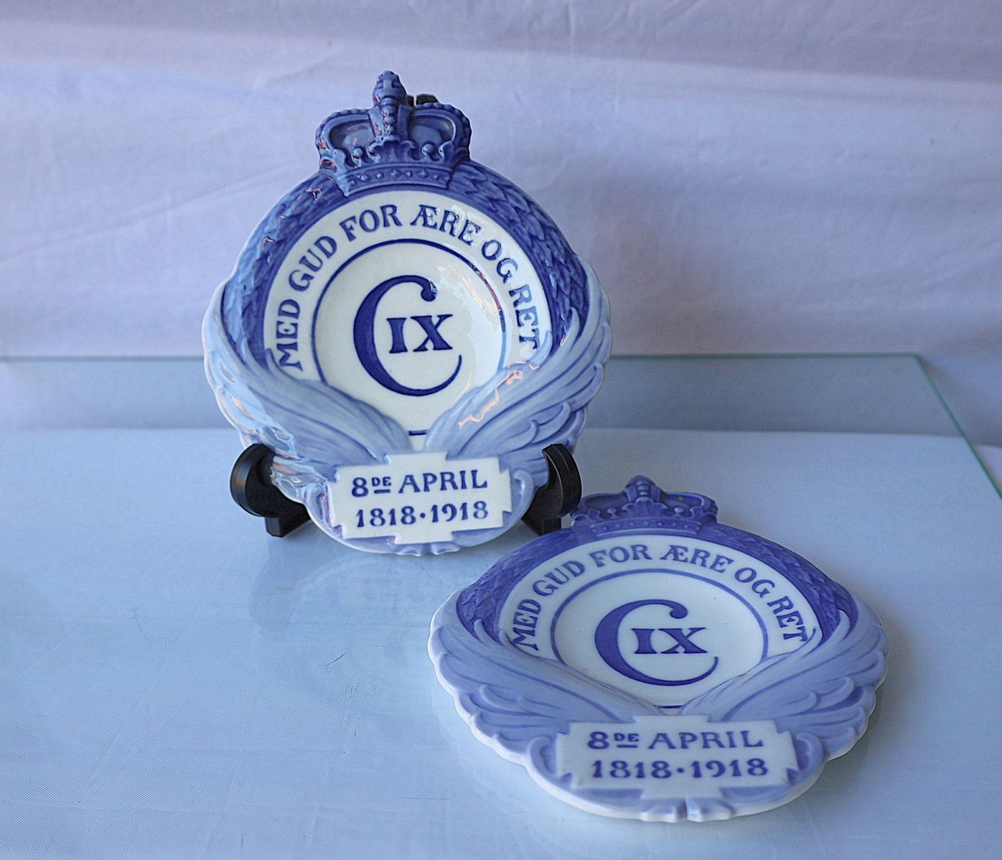 Mindeplatter1818-1918. Platterne er udgivet i anledning af Christian den 9. fødsel. Platterne er dekoreret med krone og bladværk. Indskrift på platterne: Med Gud For Ære Og Ret. Christian den 9. 8de April 1818-1918. Platterne er lavet i 3063 eksemplarer
