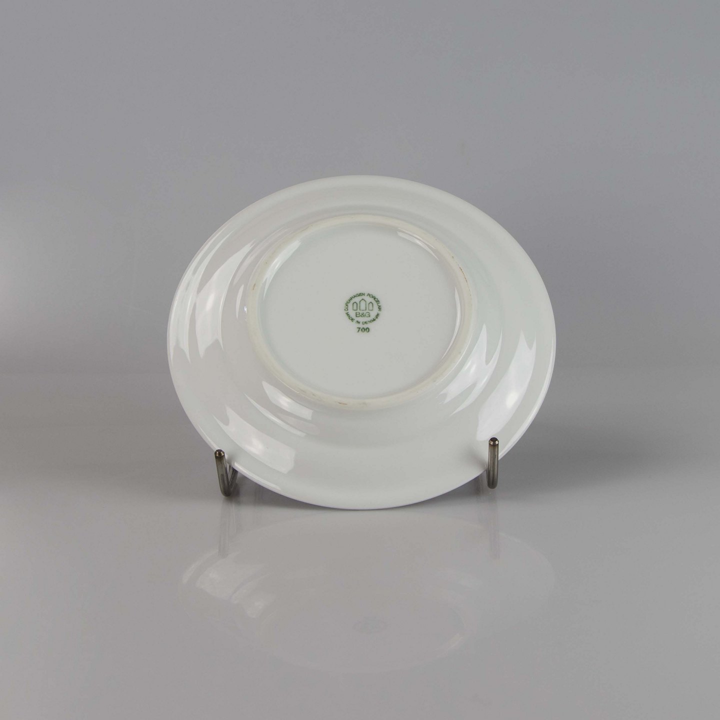 Tallerken fremstillet i hotelporcelæn med skelform i gradueret blå nuancer.