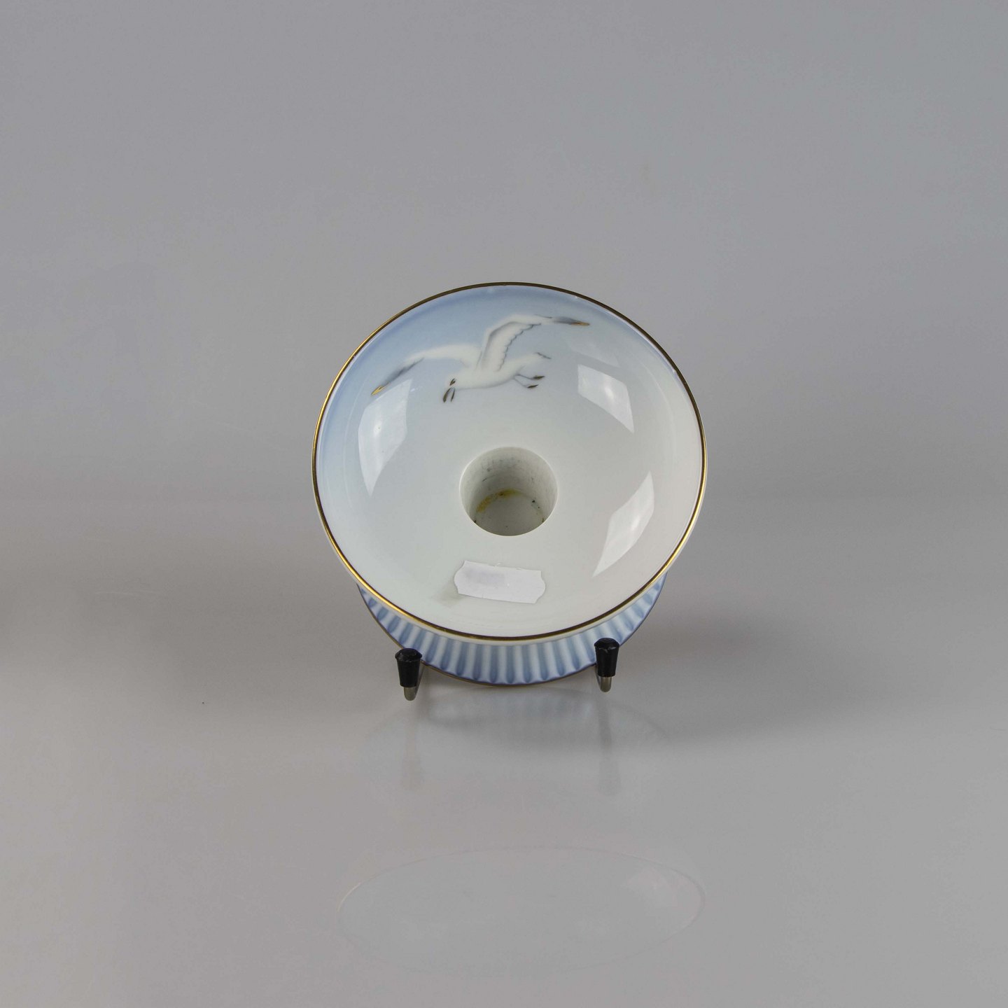 Lysestage fremstillet i porcelæn med skelform i gradueret blå nuancer med guldkant samt motiv af måge.