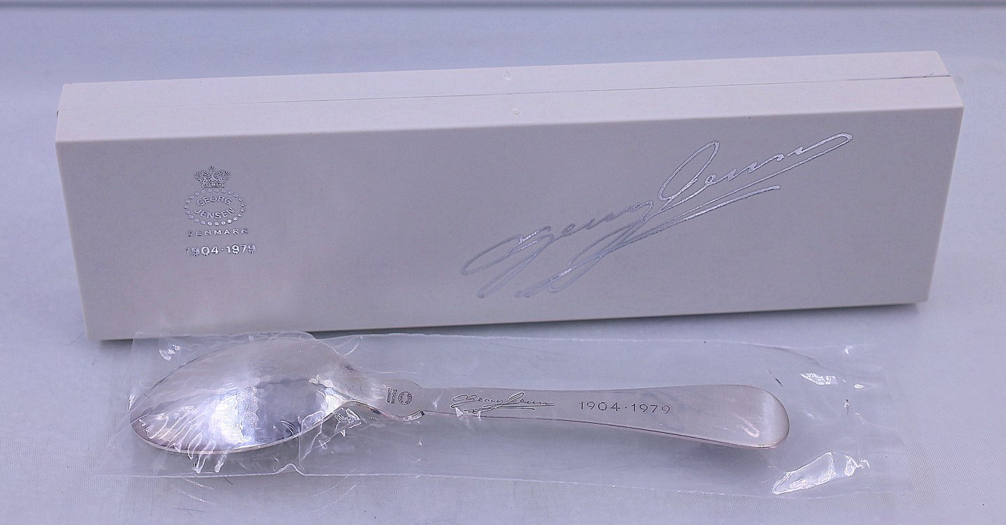 Georg Jensen, Jubilæumsske 1904-1979. Skeen er af sterling sølv. Skeen har en carneolsten som indfatning og er let hammerslået. Skeen kommer i original æske