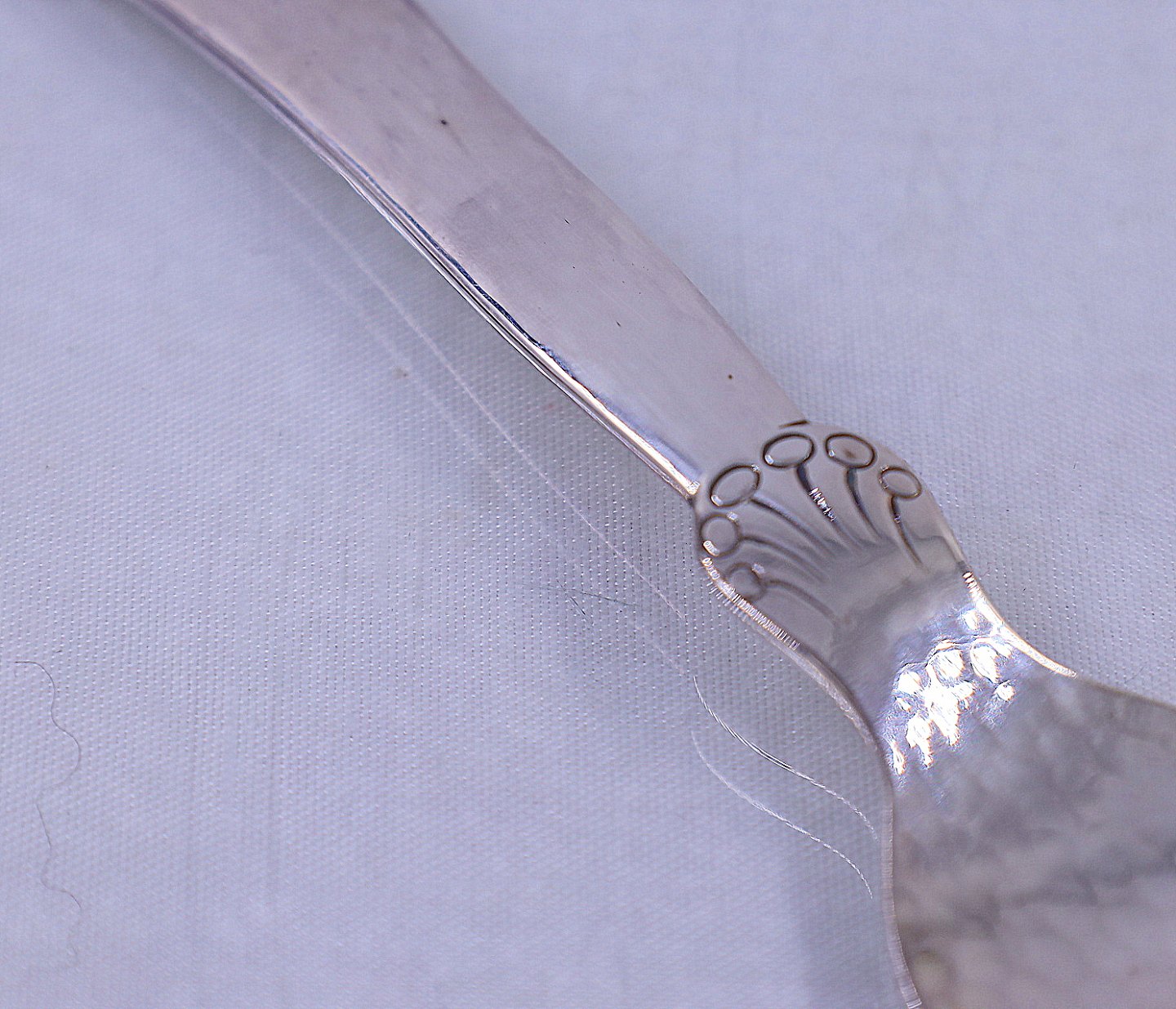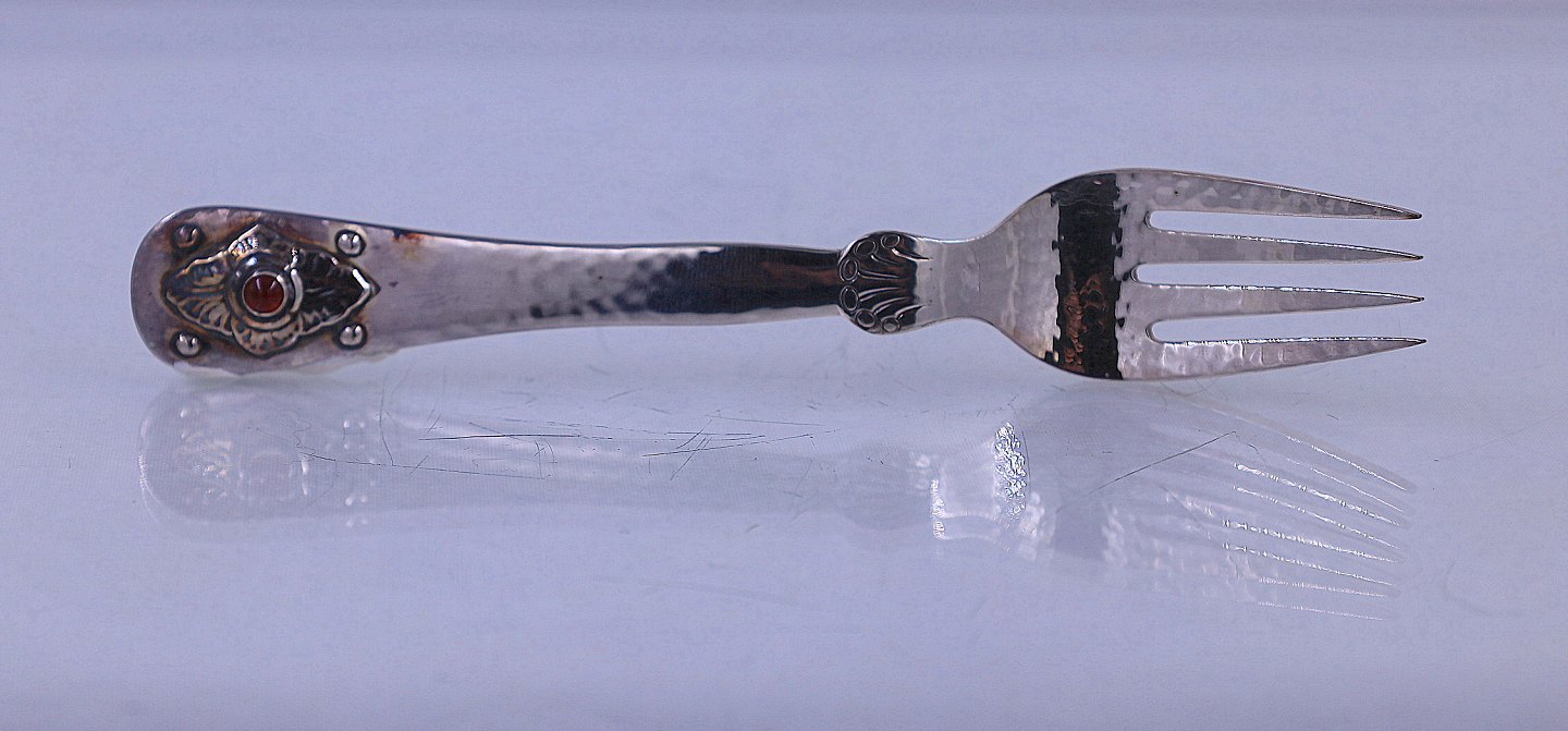 Georg Jensen, Jubilæumskniv 1904-1979. Gaflen er af sterling sølv . Gaflen har en carneolsten som indfatning og er let hammerslået. Gaflen kommer i original æske