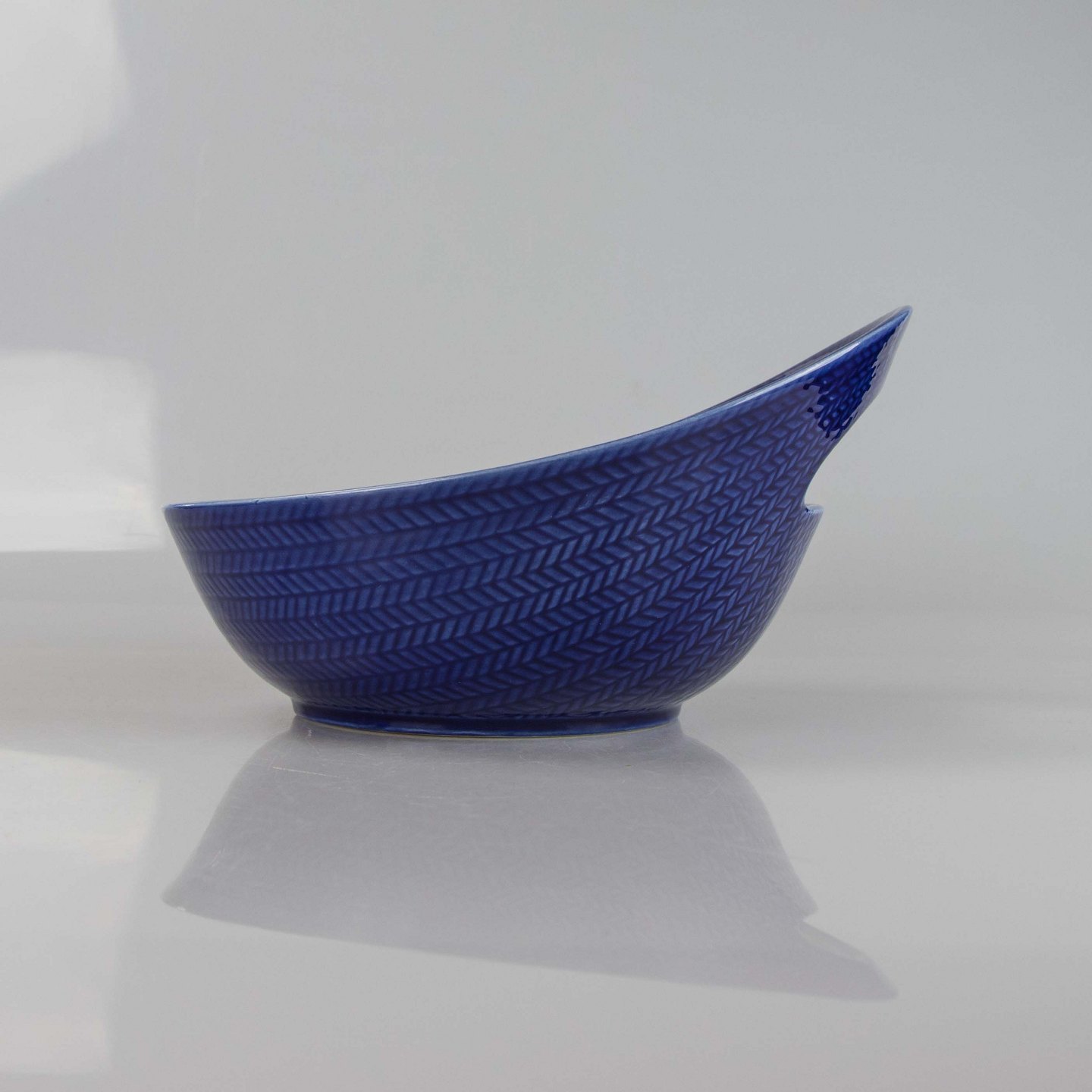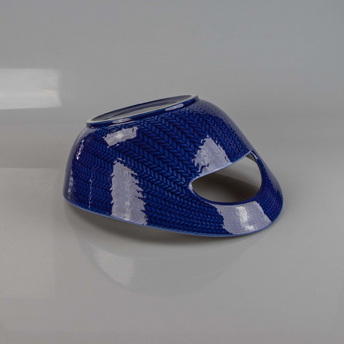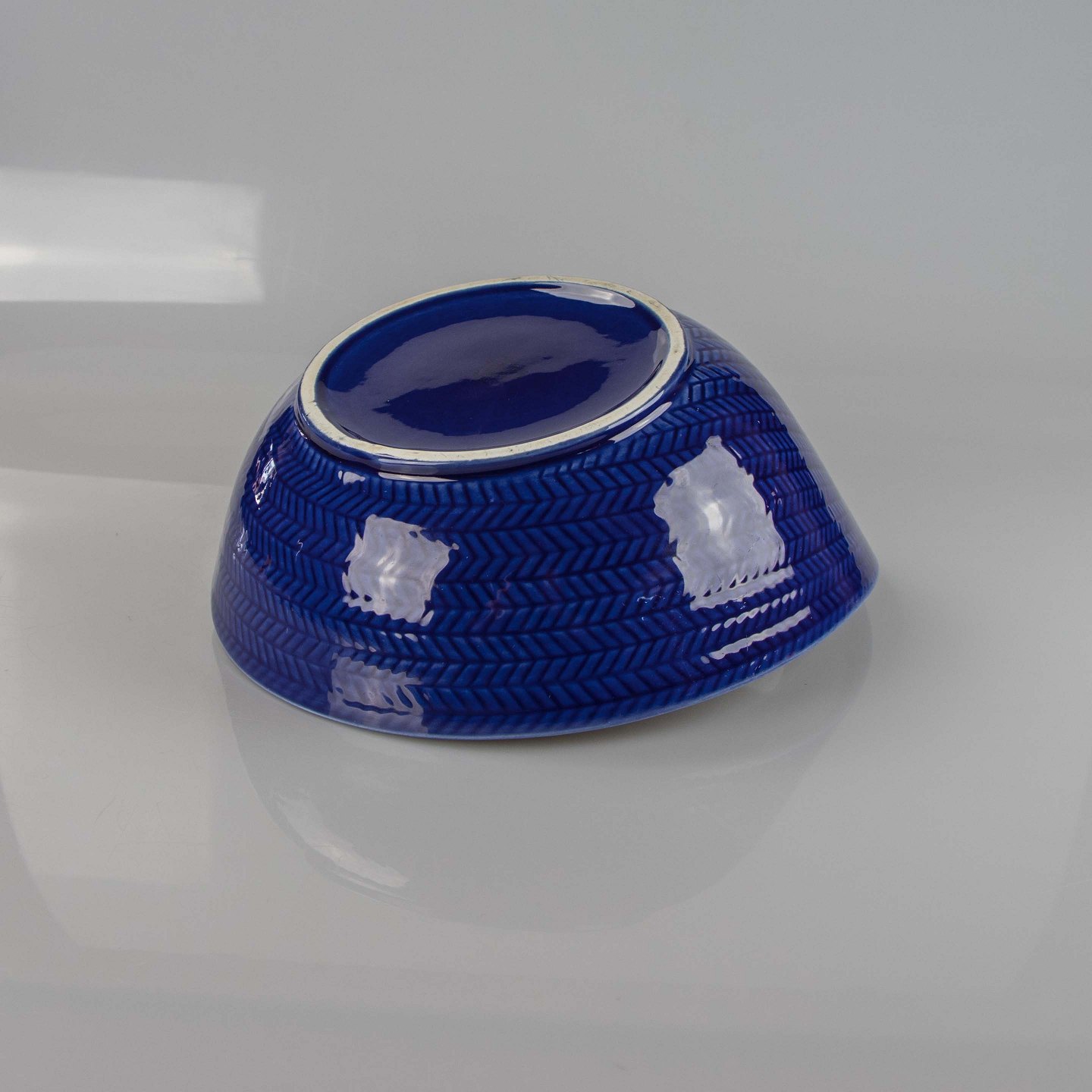 Skål fremstillet i blå fajance med indstøbt sildebensmønster.