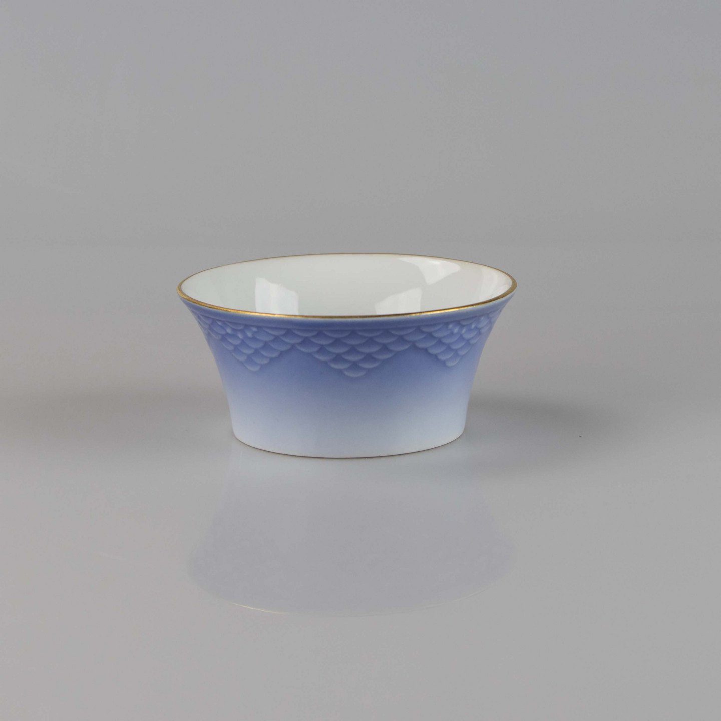Bæger fremstillet i porcelæn med skelform i gradueret blå nuancer med guldkant samt motiv af måge.