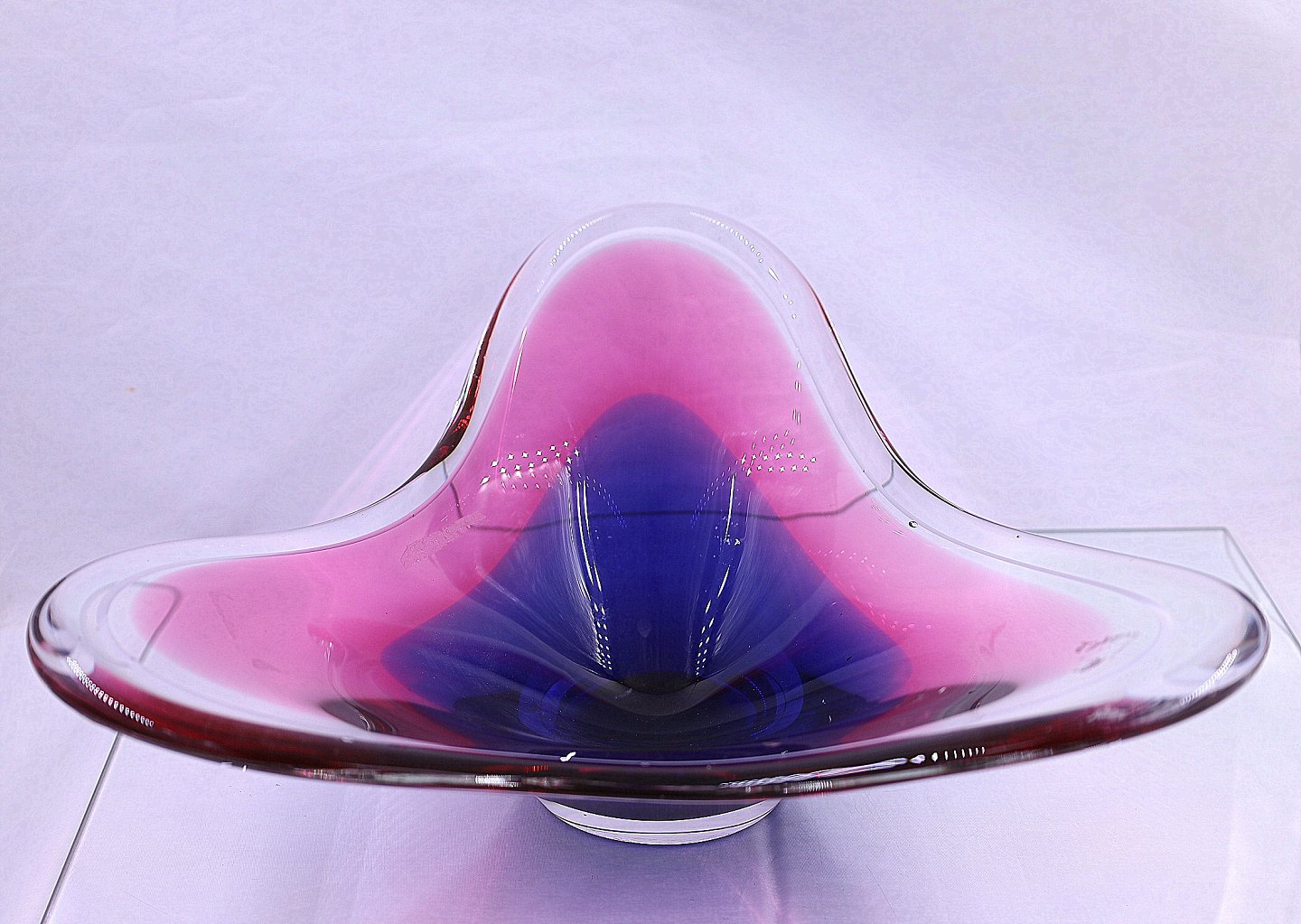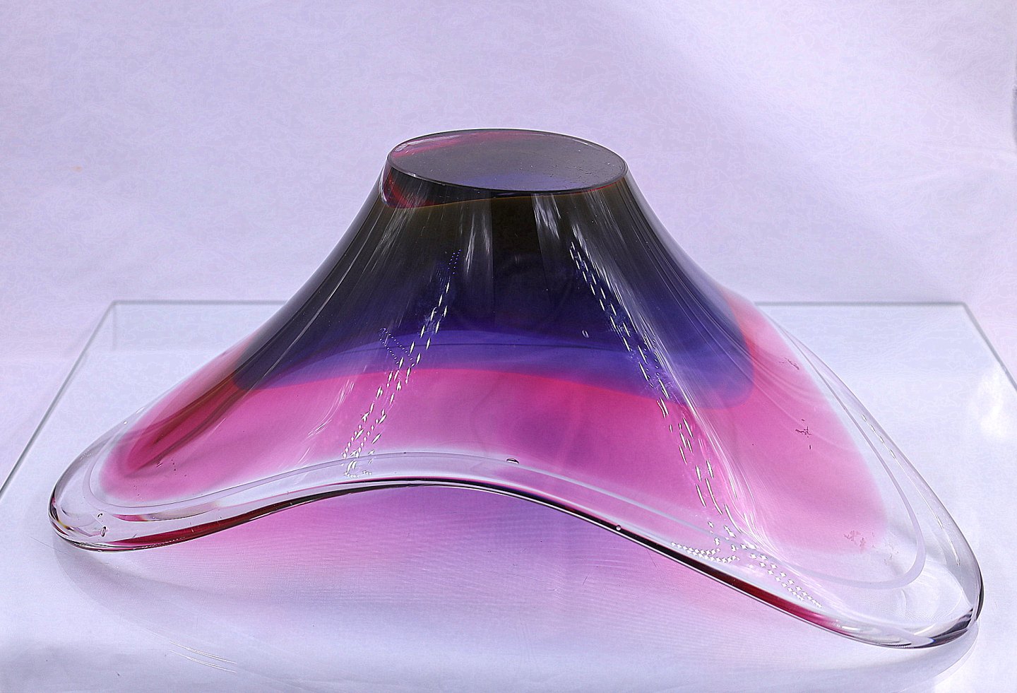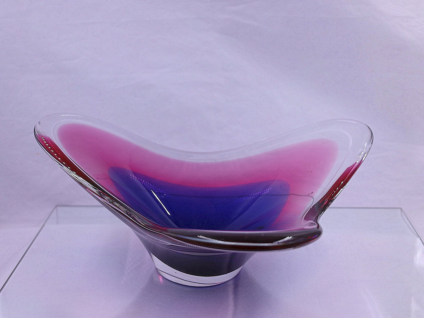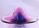 Flygsfors. Coquille skål, skålen har farverne lilla, lys rød og klart glas. Skålen er formet med 3 "vinger".