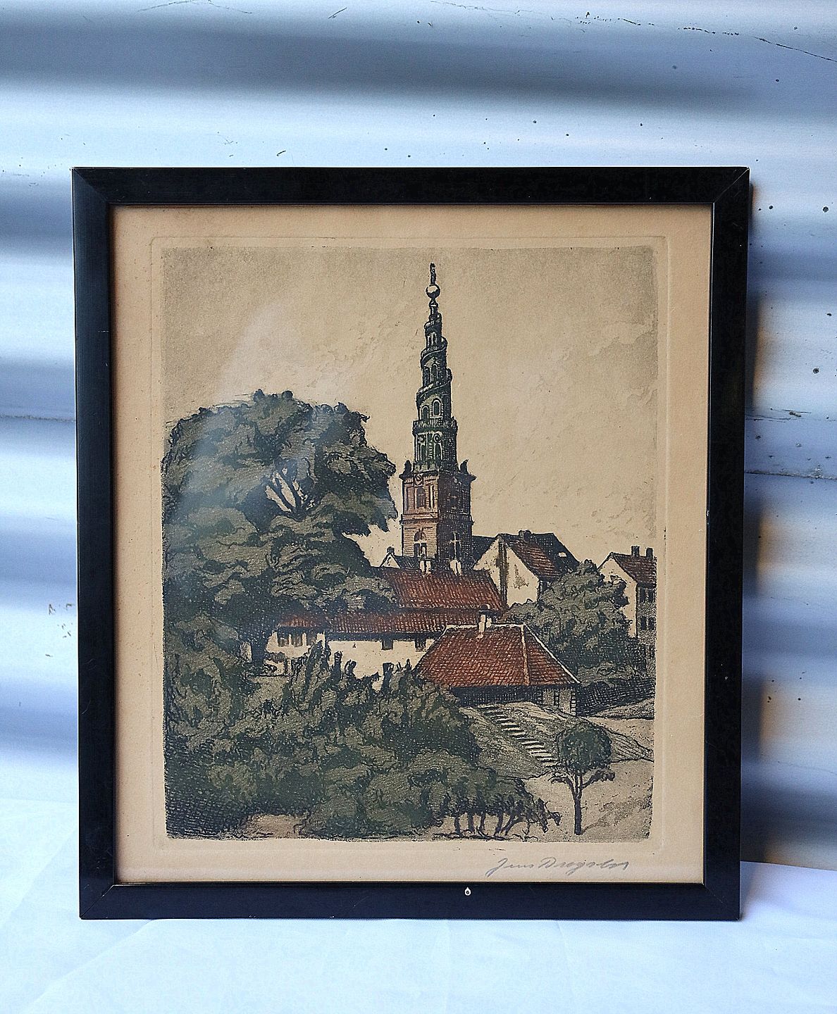 Indrammmet radering i sortmalet træramme med motiv af Christians Havn med Vor frelser Kirke i baggrunden