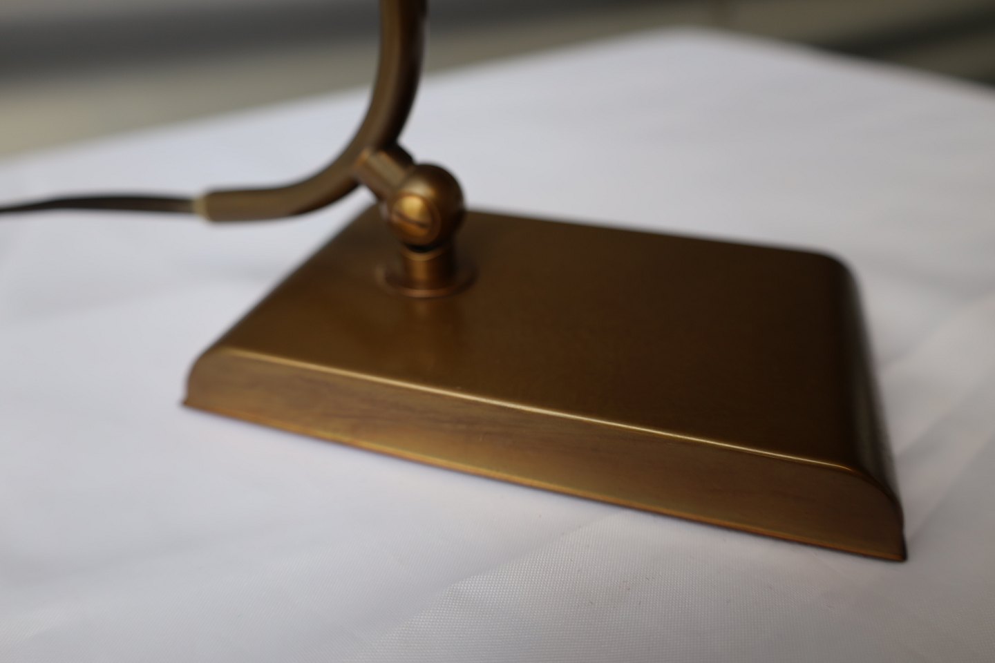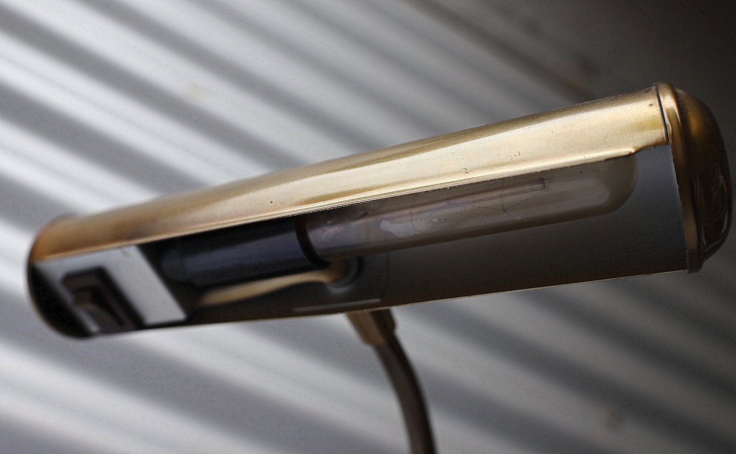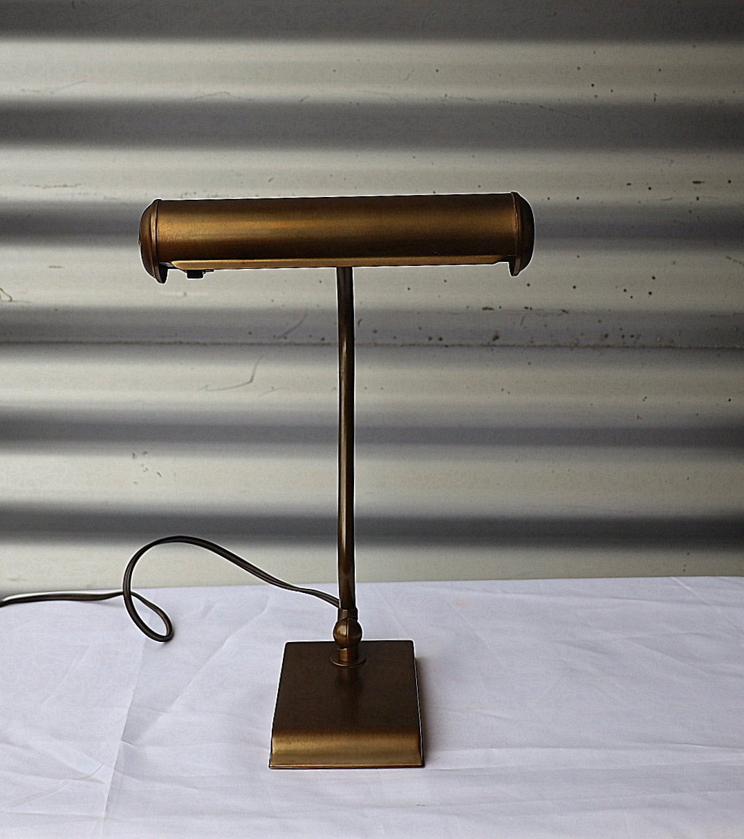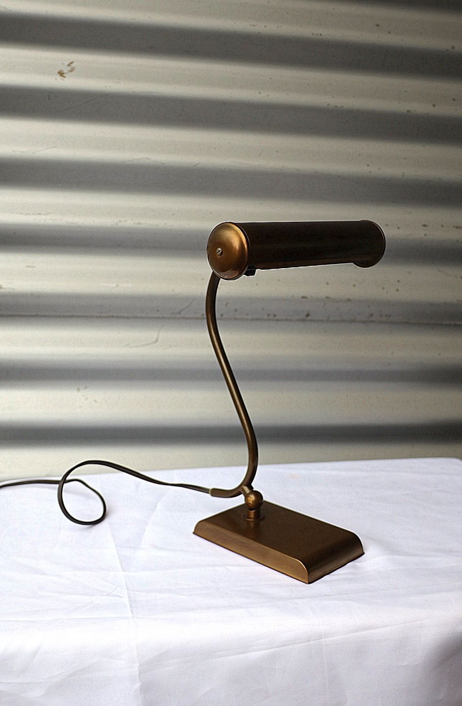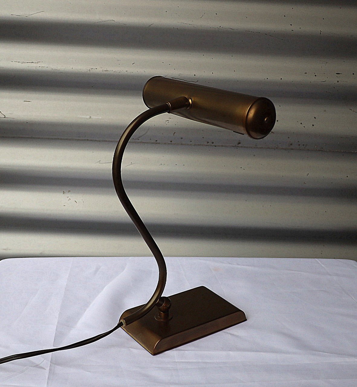 Klaverlampe, med svunget hals, i messing. Ledningen er original.
