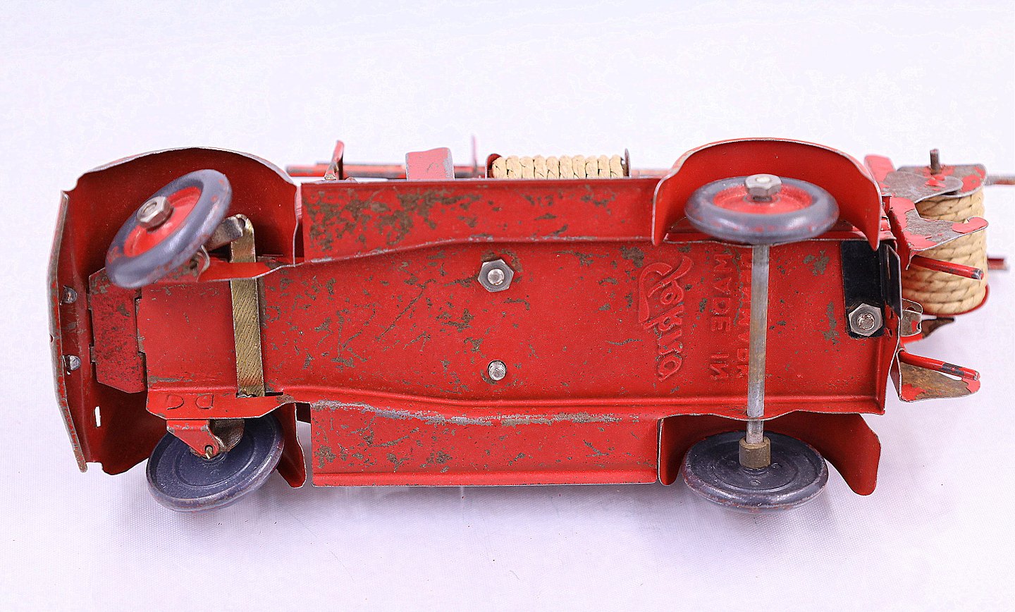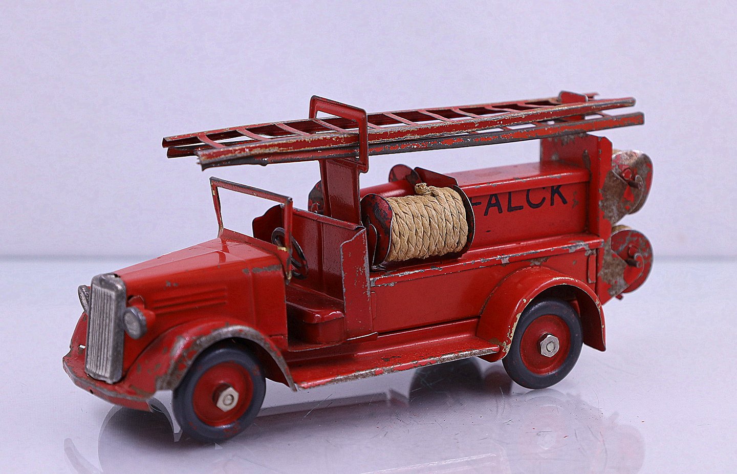 Falck Stige vogn. Stige vogn med aftagelige stiger. Tekno, Made in Denmark, bilen er lavet af blik. Der er brugsspor på bilen