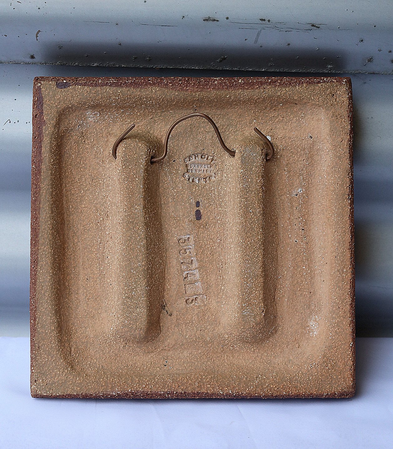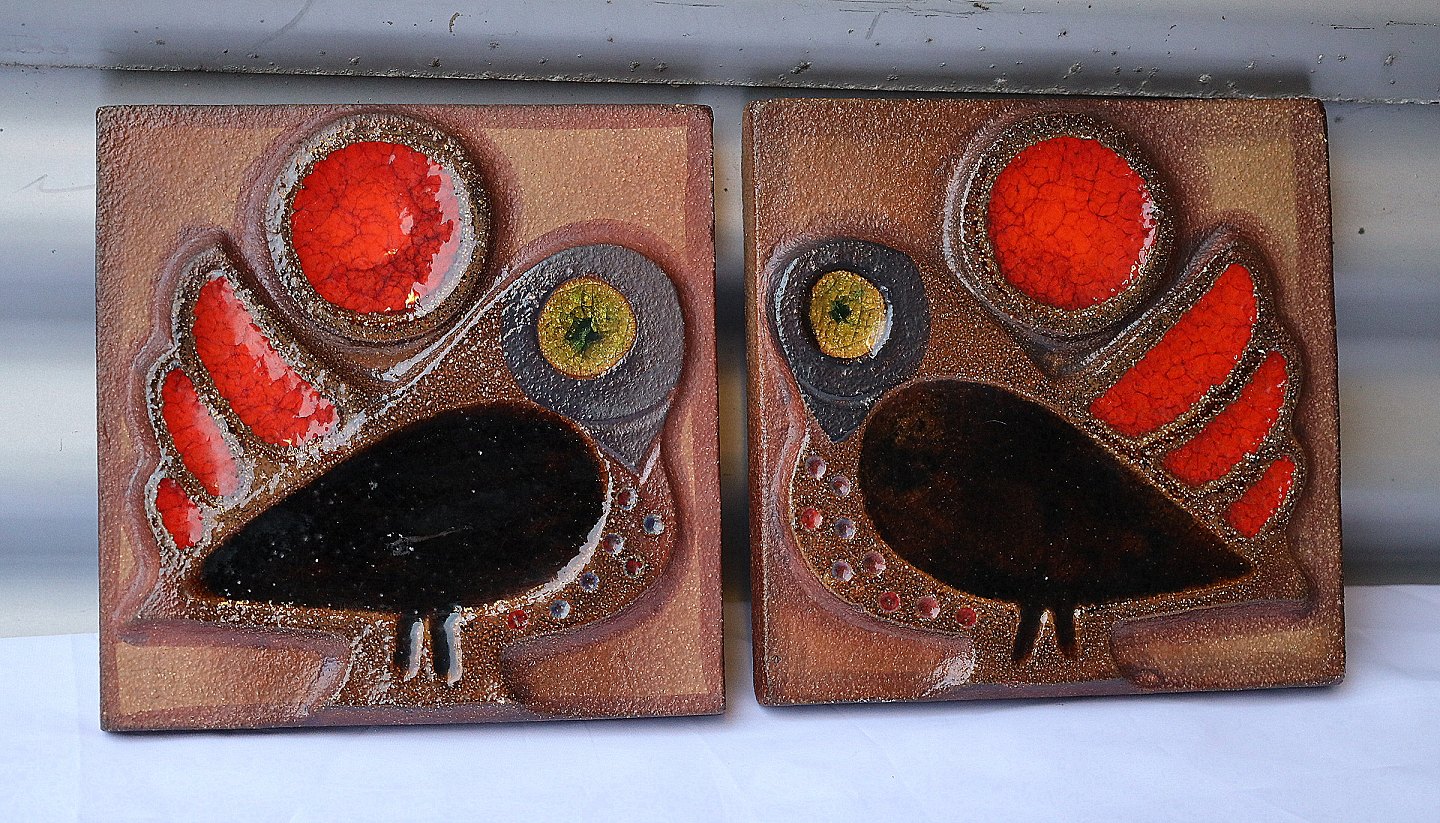 Søholm Keramik. relief, nr. 3574-4, af en fugl med rød vinge, der er også en rød sol. Relieffet er nr. 4 af en serie på 4