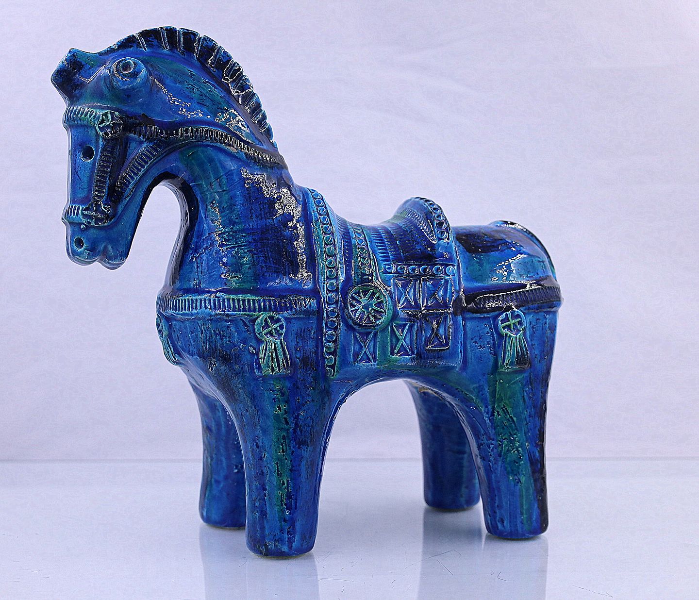 Blå hest af blå glaseret stentøj. Hesten er fra 1960`erne.