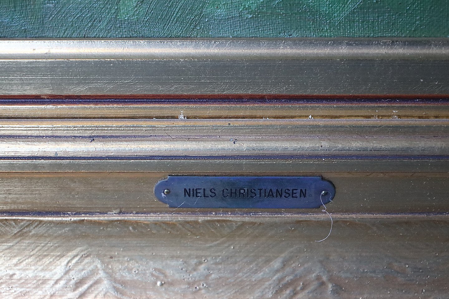 Maleri, Niels Christiansen (1873-1960). Græssende kreaturer på engen. Signeret N. Chr. Maleriet er i guldramme, med ornamentering i hjørnerne, der er enkelte brugsspor på rammen.