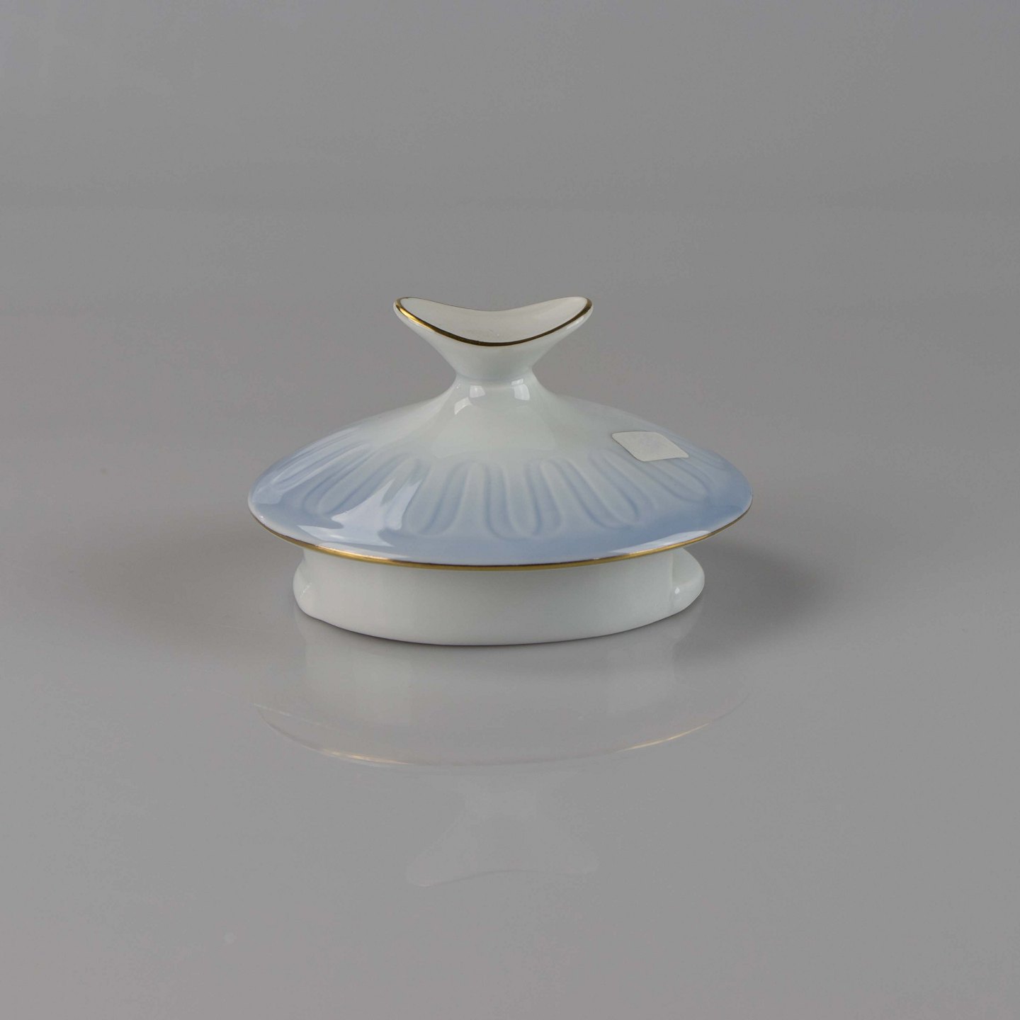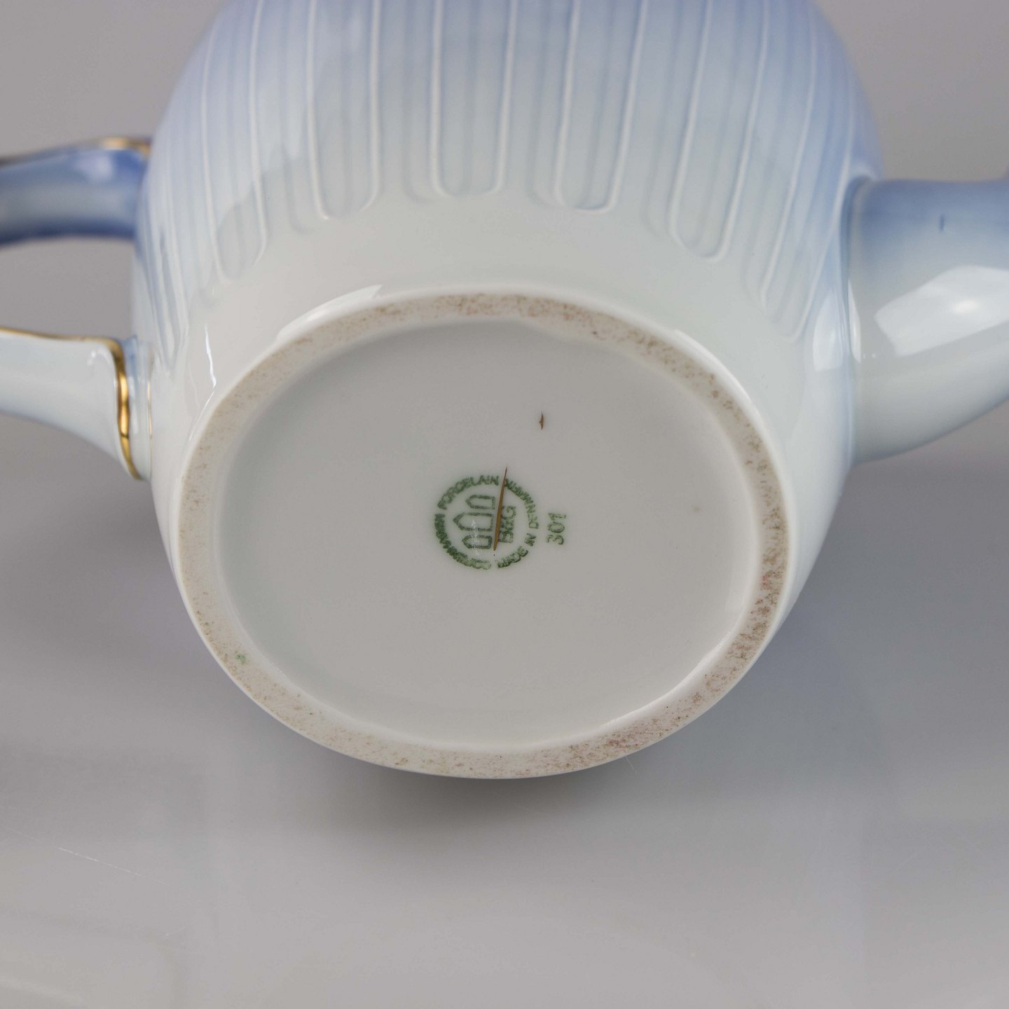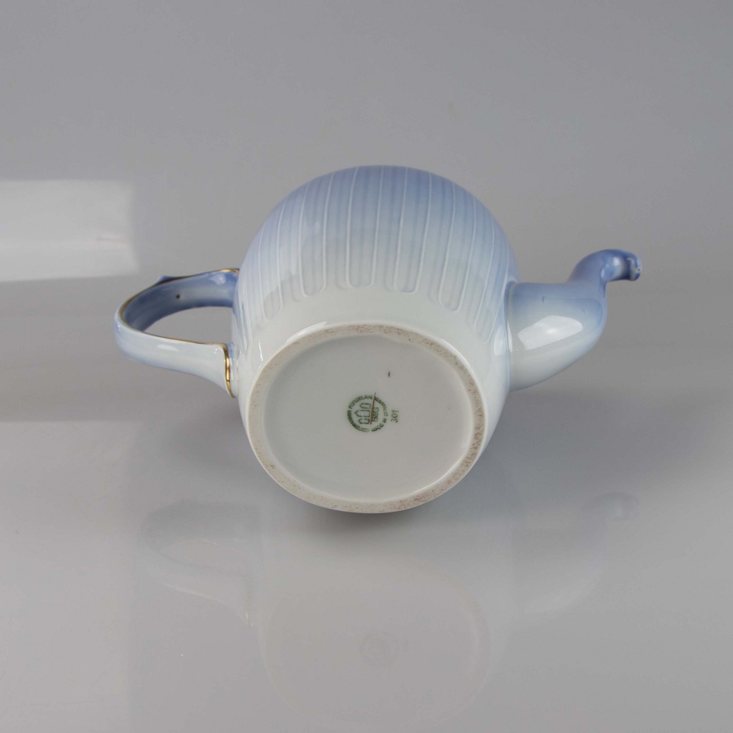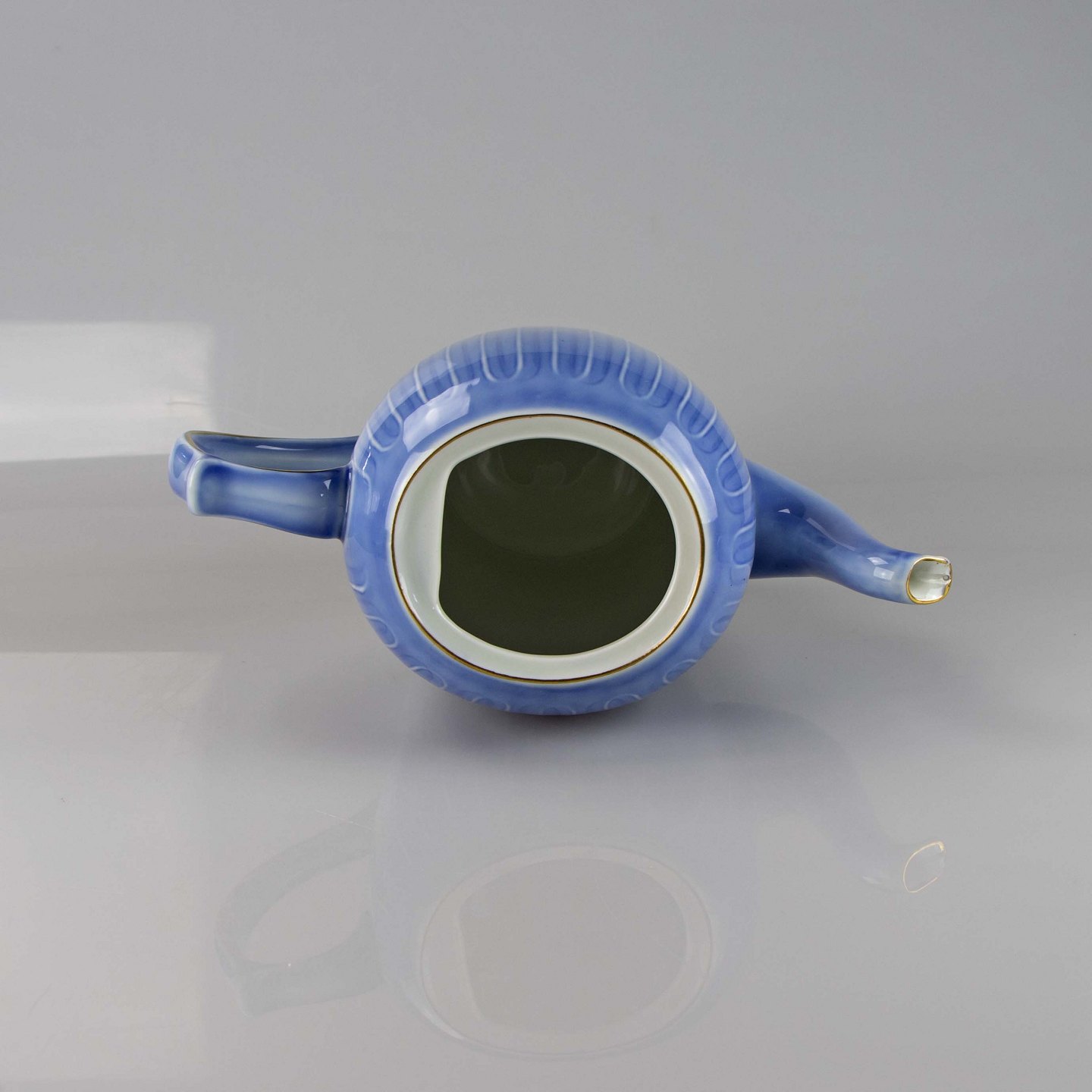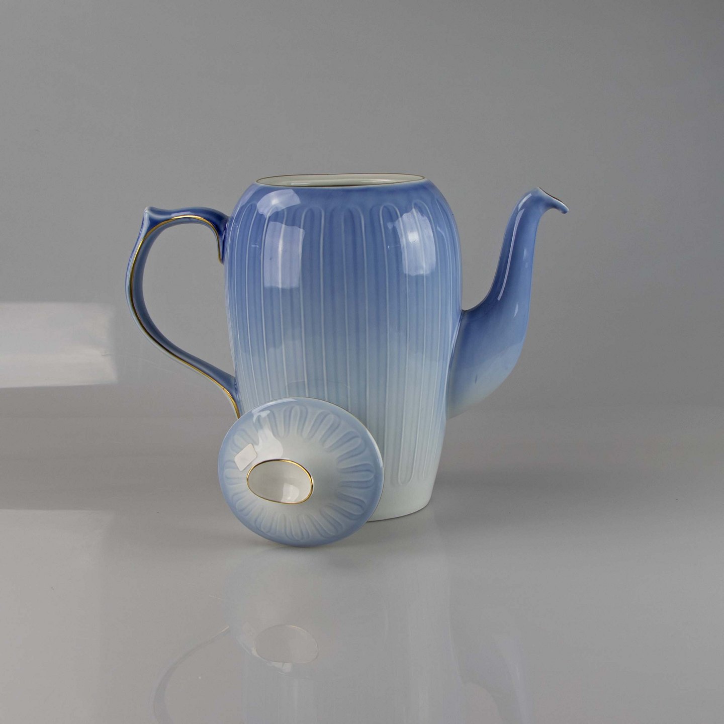 Kande fremstillet i porcelæn med stribet motiv i gradueret blå nuancer.