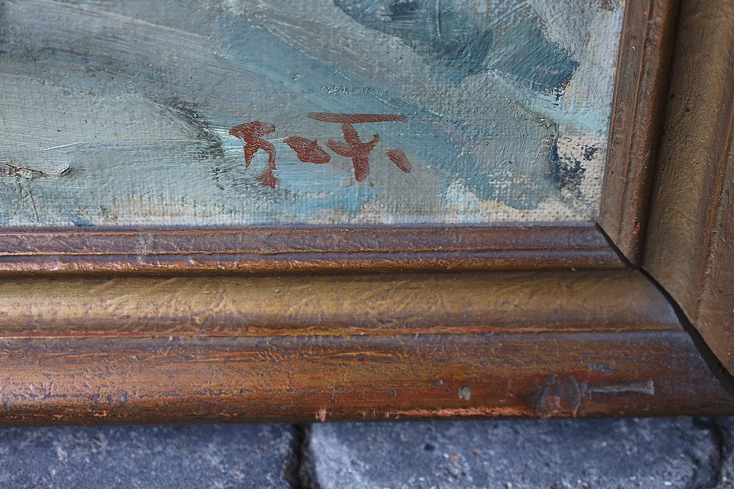 Maleri, Aage Bernhard Frederiksen (1883-1963). Parti af vej, i tøvejr, der ligger et rødt hus ved den ene side af vejen. Signeret B.F.. Maleriet er i en mørk guldramme, der har enkelte brugsspor