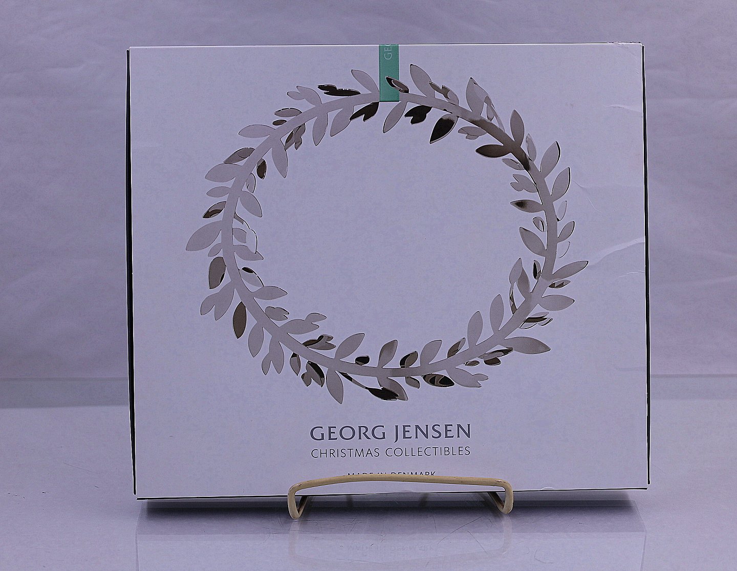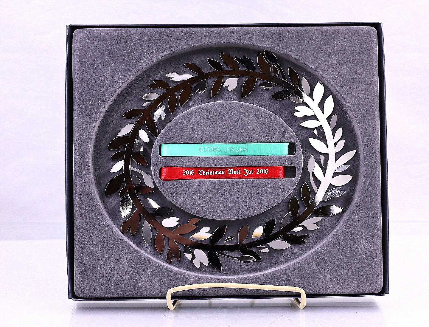 Georg Jensen. Juleuro 2016, magnolia krans. Juleuroen er fra Christmas Collectibles. Uroen er messing belagt med palladium, der er et sølvlignende materiale, og kommer i original æske, der medfølger også et rødt og et mintgrønt bånd.
