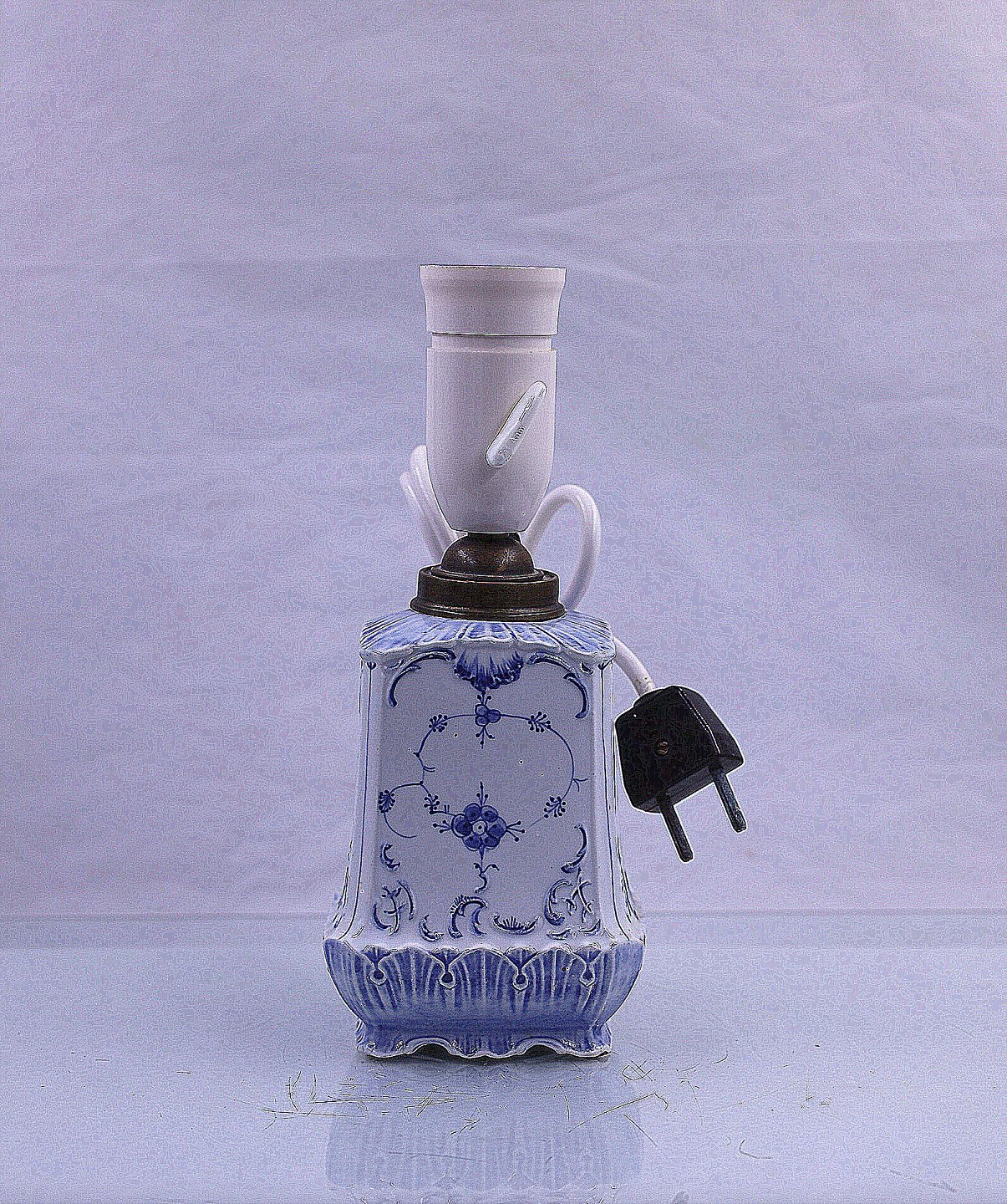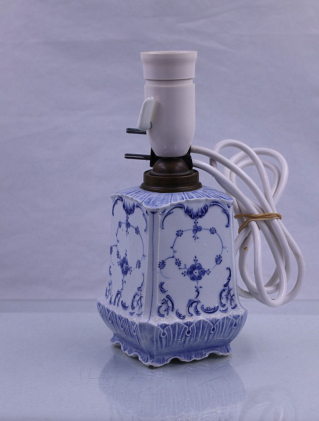 Bordlampe musselmalet, lampen er af porcelæn. Lampen er 4-kantet, der sidder afbryder på selve lampen.