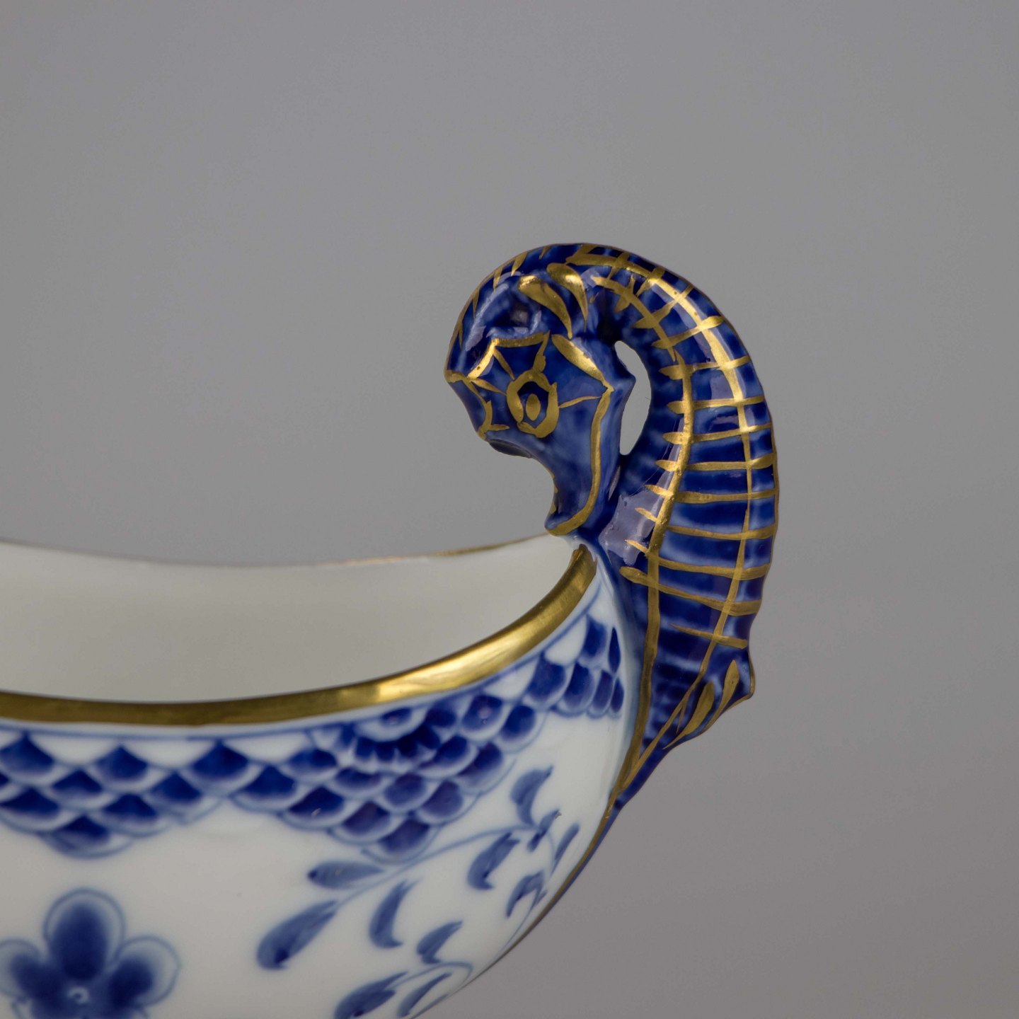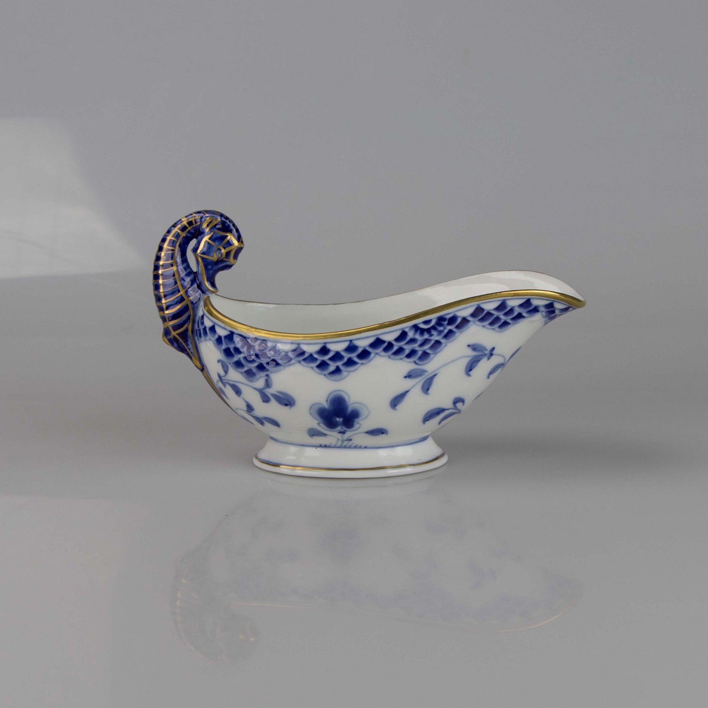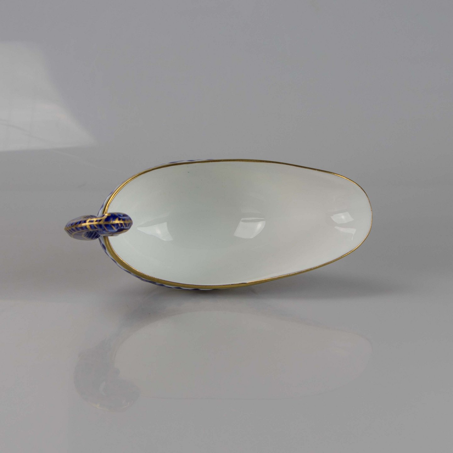 Smørnæb i hvidt porcelæn med guldkant med blå motiver af blomster og sommerfugle.