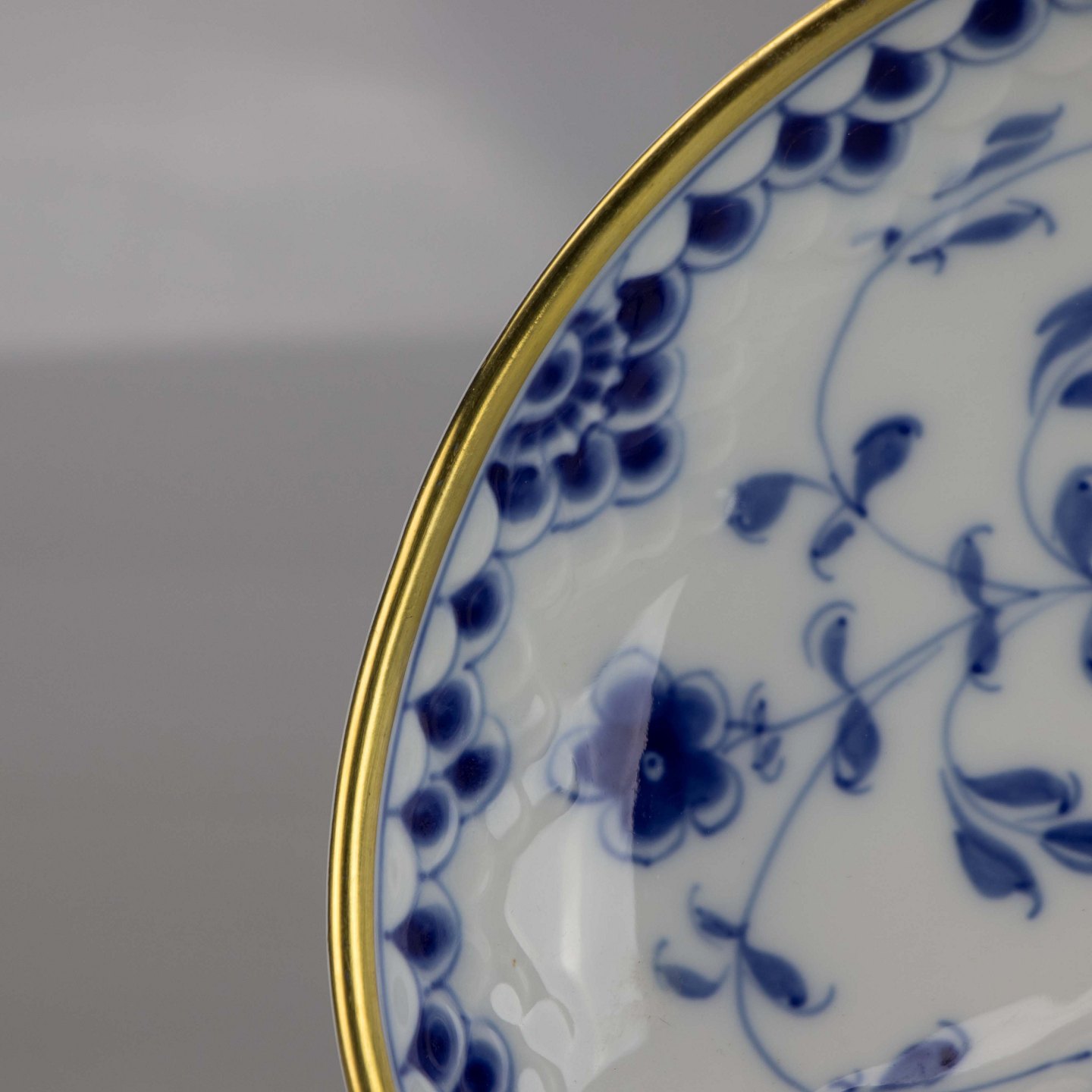 Asiet i hvidt porcelæn med guldkant med blå motiver af blomster og sommerfugle.