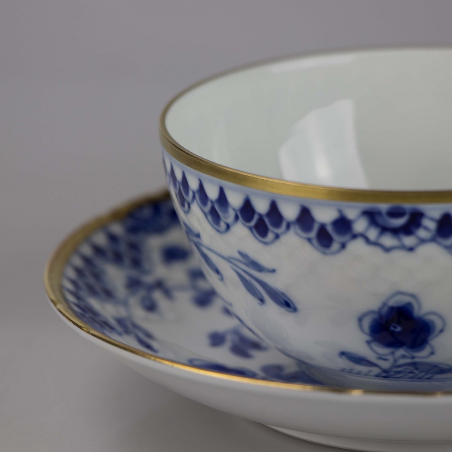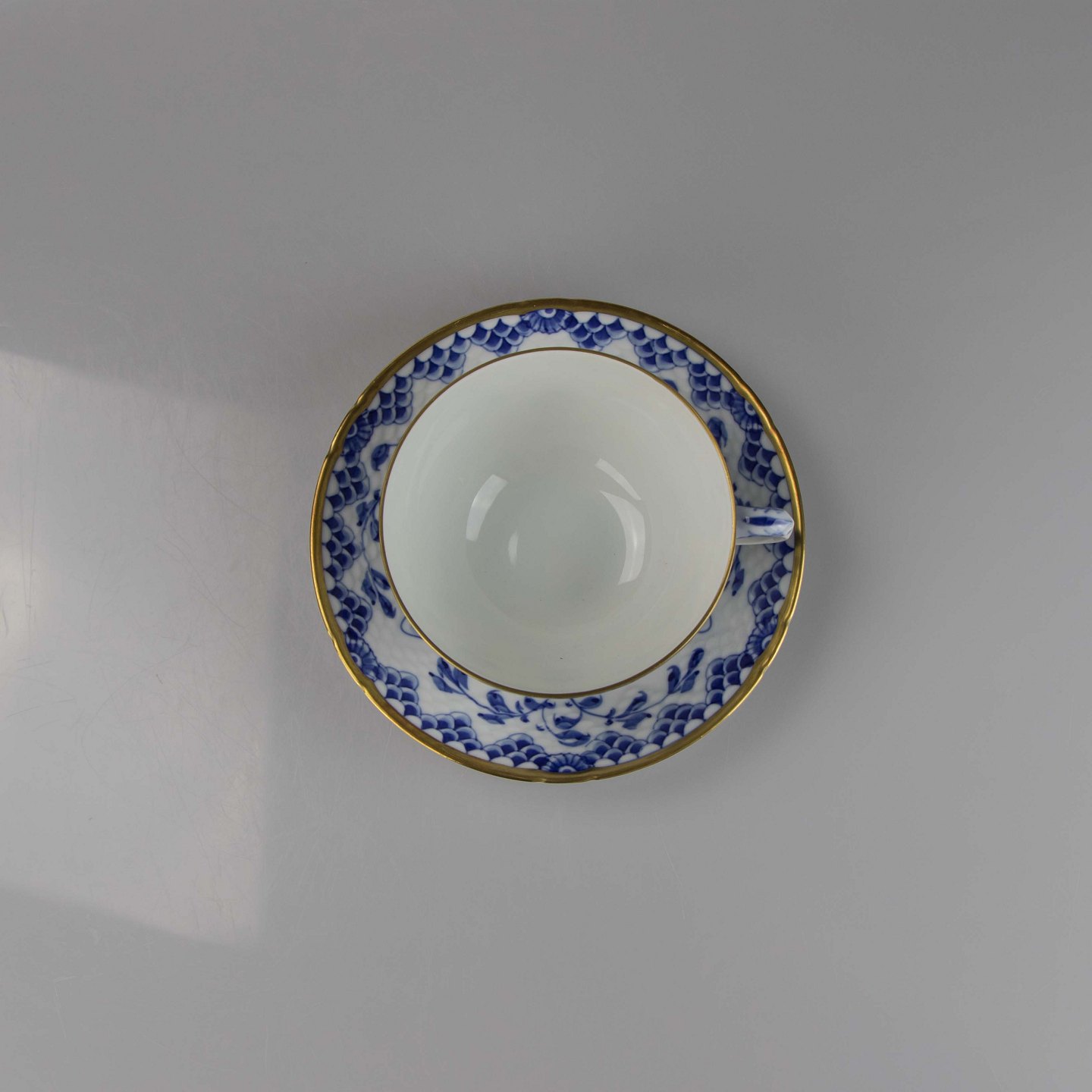 Kop i hvidt porcelæn med guldkant med blå motiver af blomster og sommerfugle.