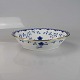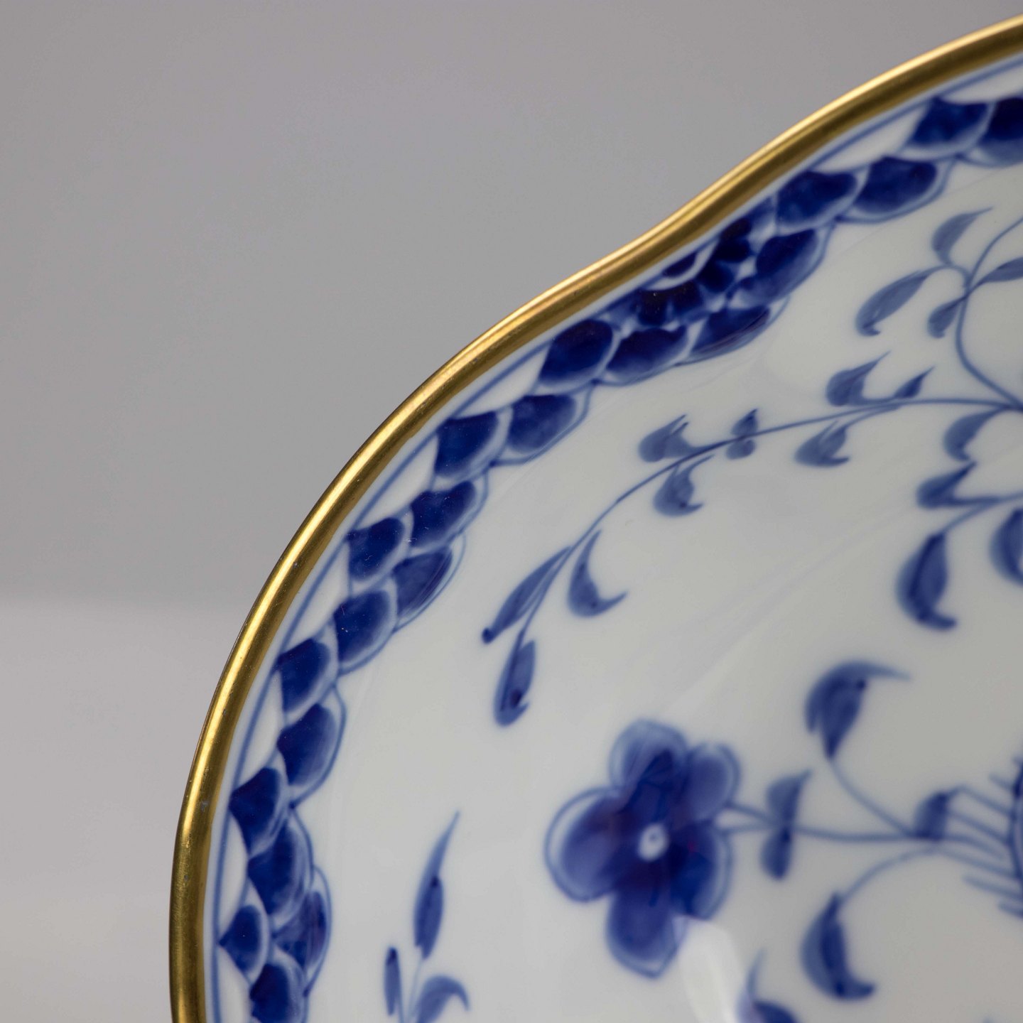 Skål i hvidt porcelæn med guldkant med blå motiver af blomster og sommerfugle.