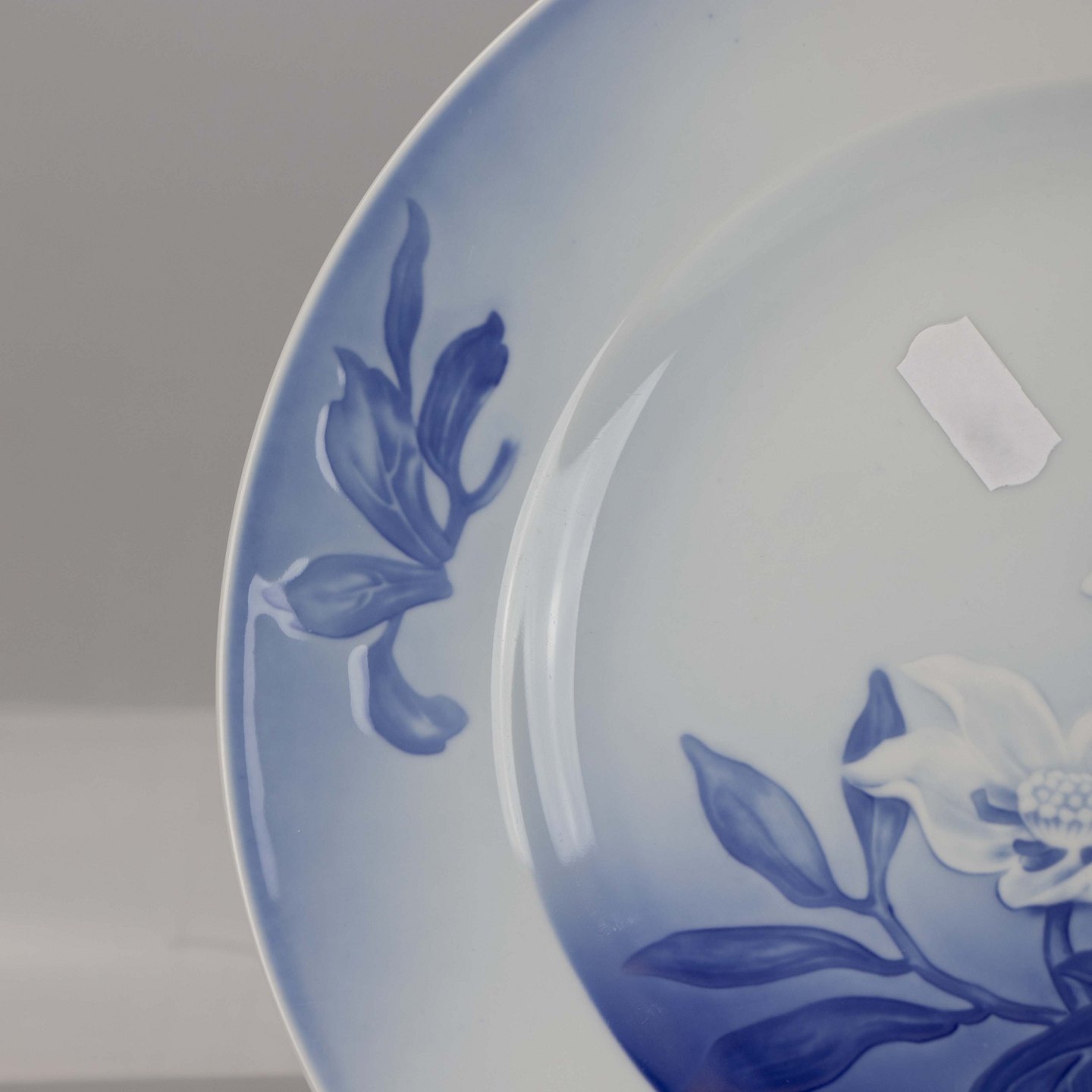 Flad tallerken i hvidt og gradueret blå porcelæn med motiv af julerose.