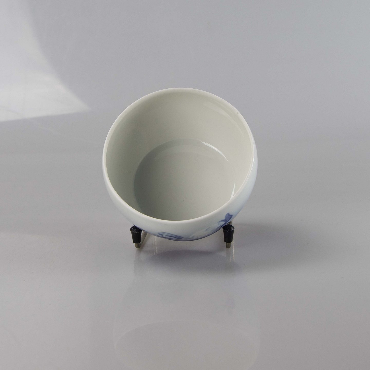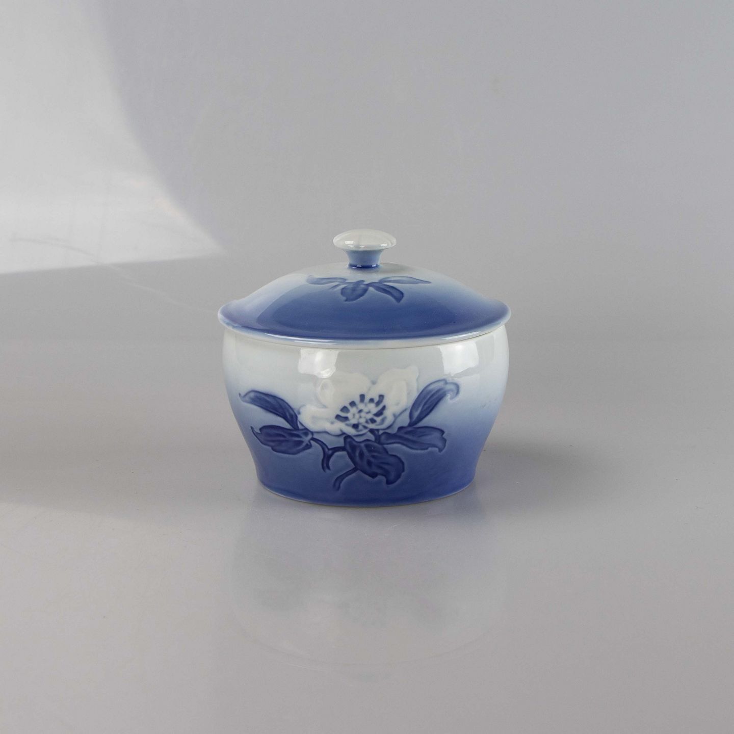 Lågkrukke i hvidt og gradueret blå porcelæn med motiv af julerose.