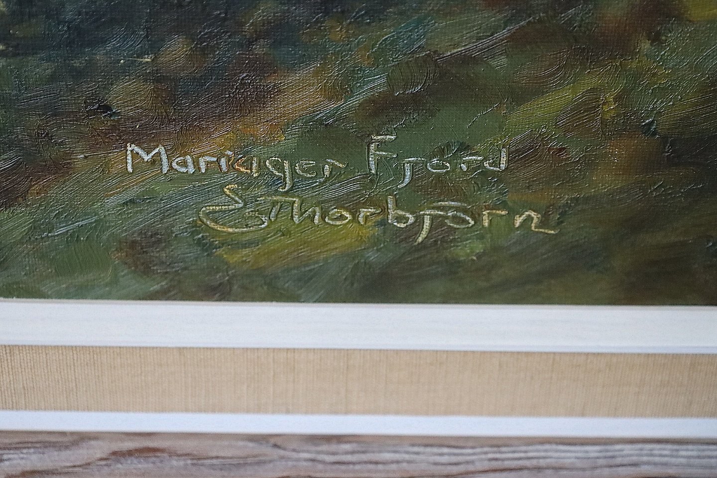 E. Thorbjørn, Evelyn Bøje Thorbjørn Født 1911. Scene fra Mariager Fjord. Maleriet er indrammet i træramme, med indvendig lærredsramme. Signeret E. Thorbjørn