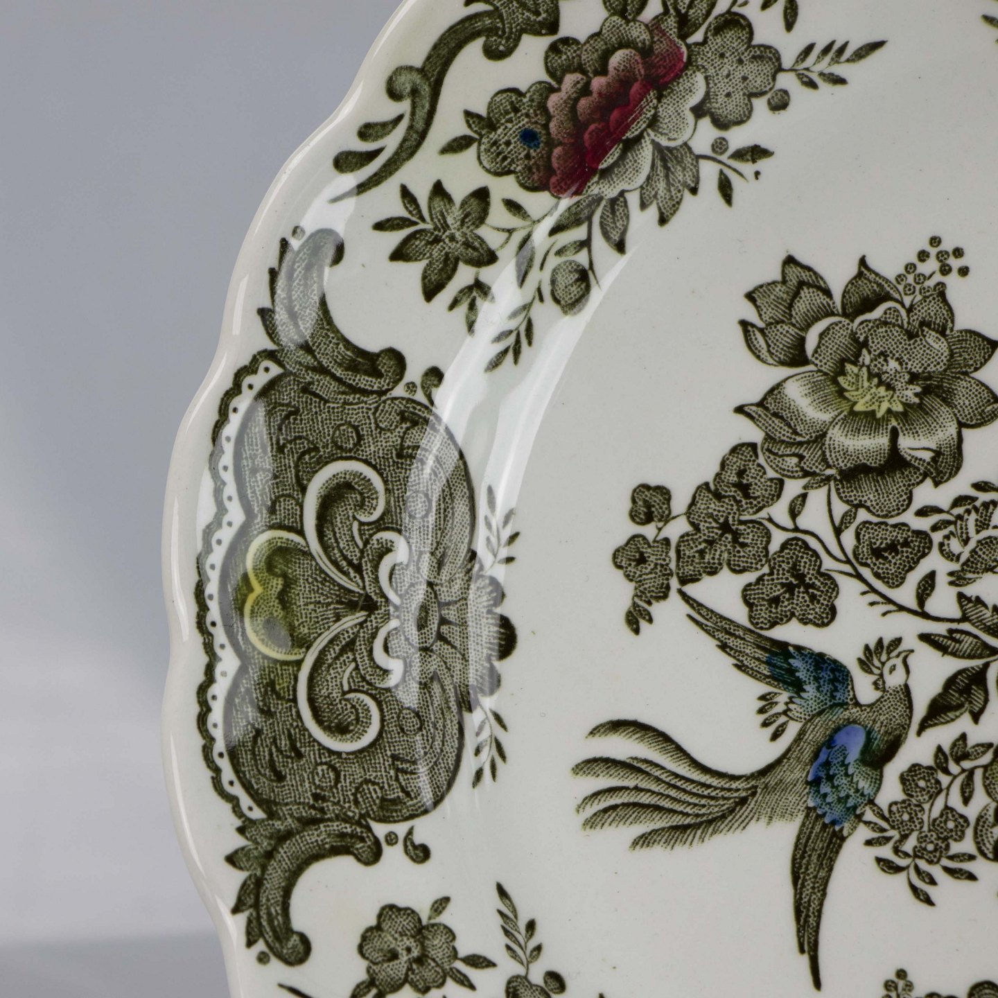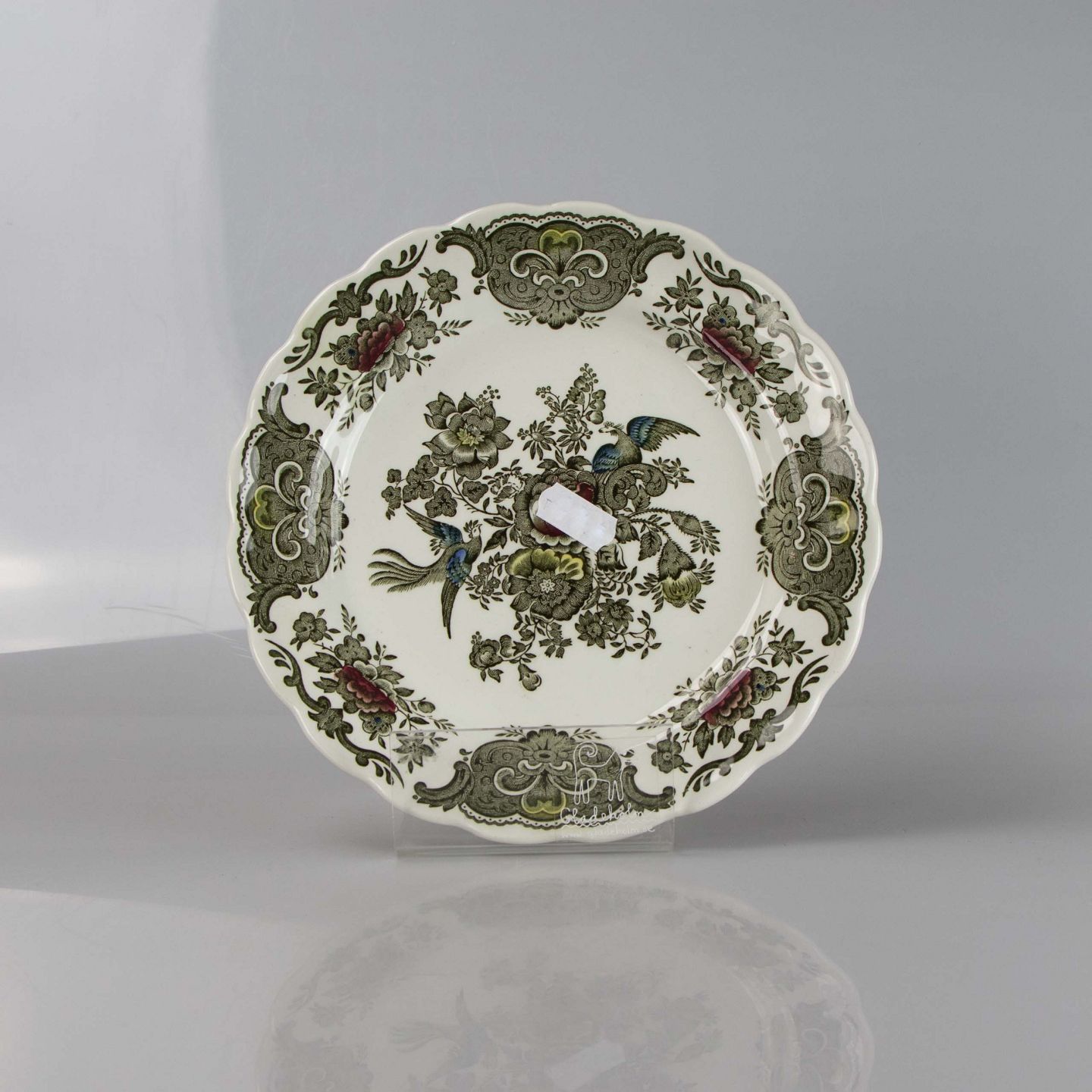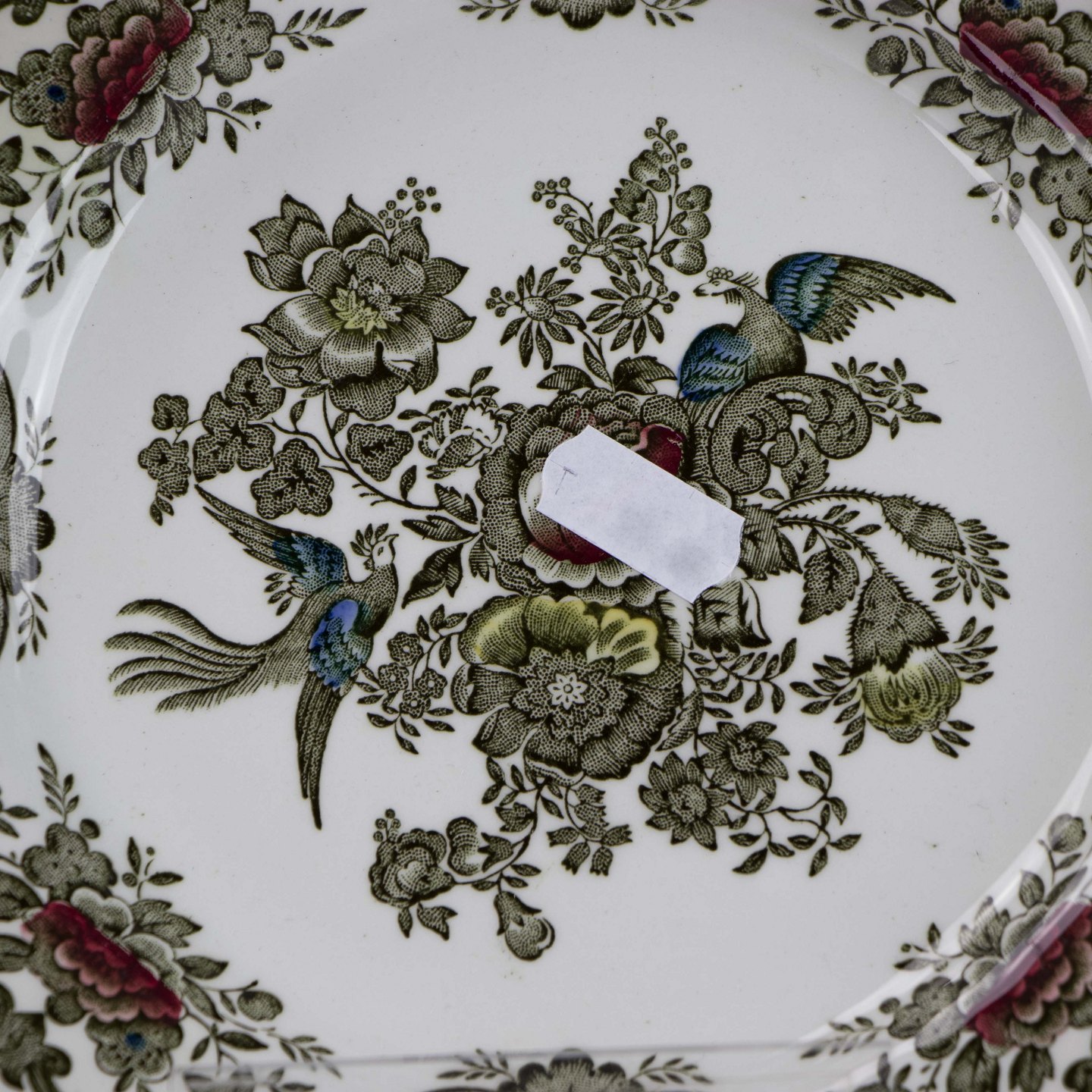 Tallerken i hvid fajance med multifarvet motiv af blomster og fugle.
