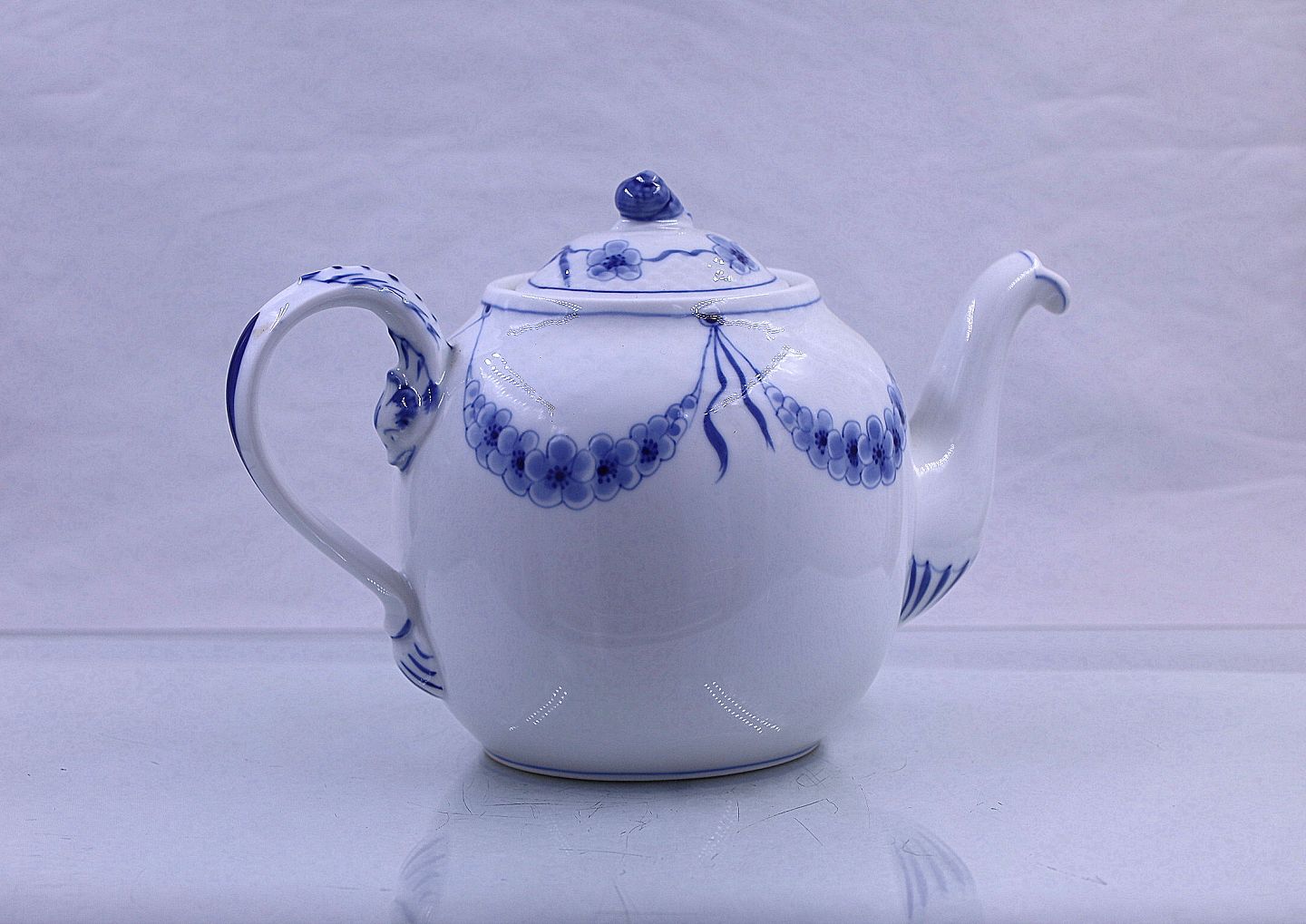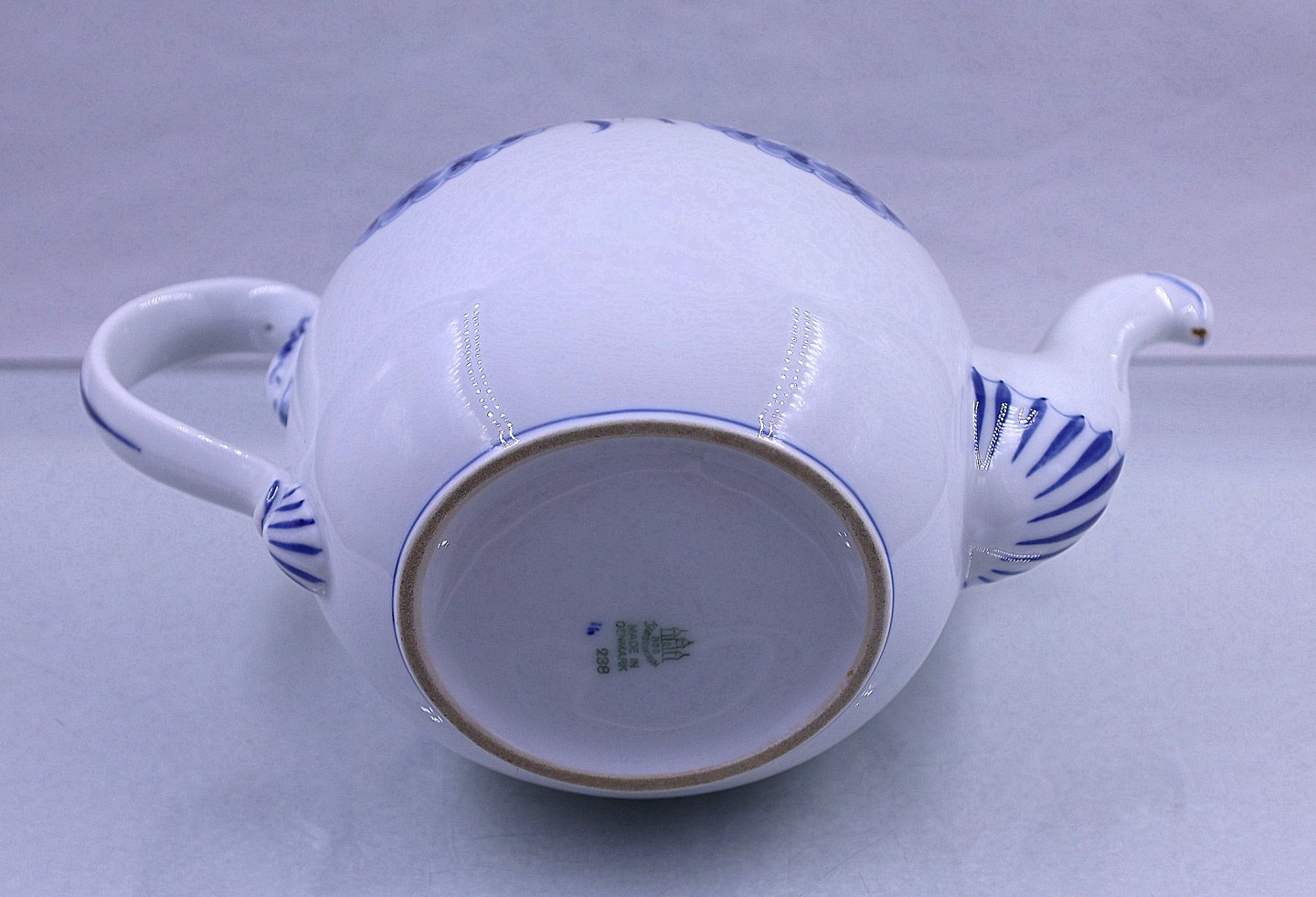 Bing & Grøndahl. Empire Thekande nr. 238, thekanden er oval. Empire er hvidt med skælborter og svungne blomster dekorationer. Thekanden har brugsspor indvendig.