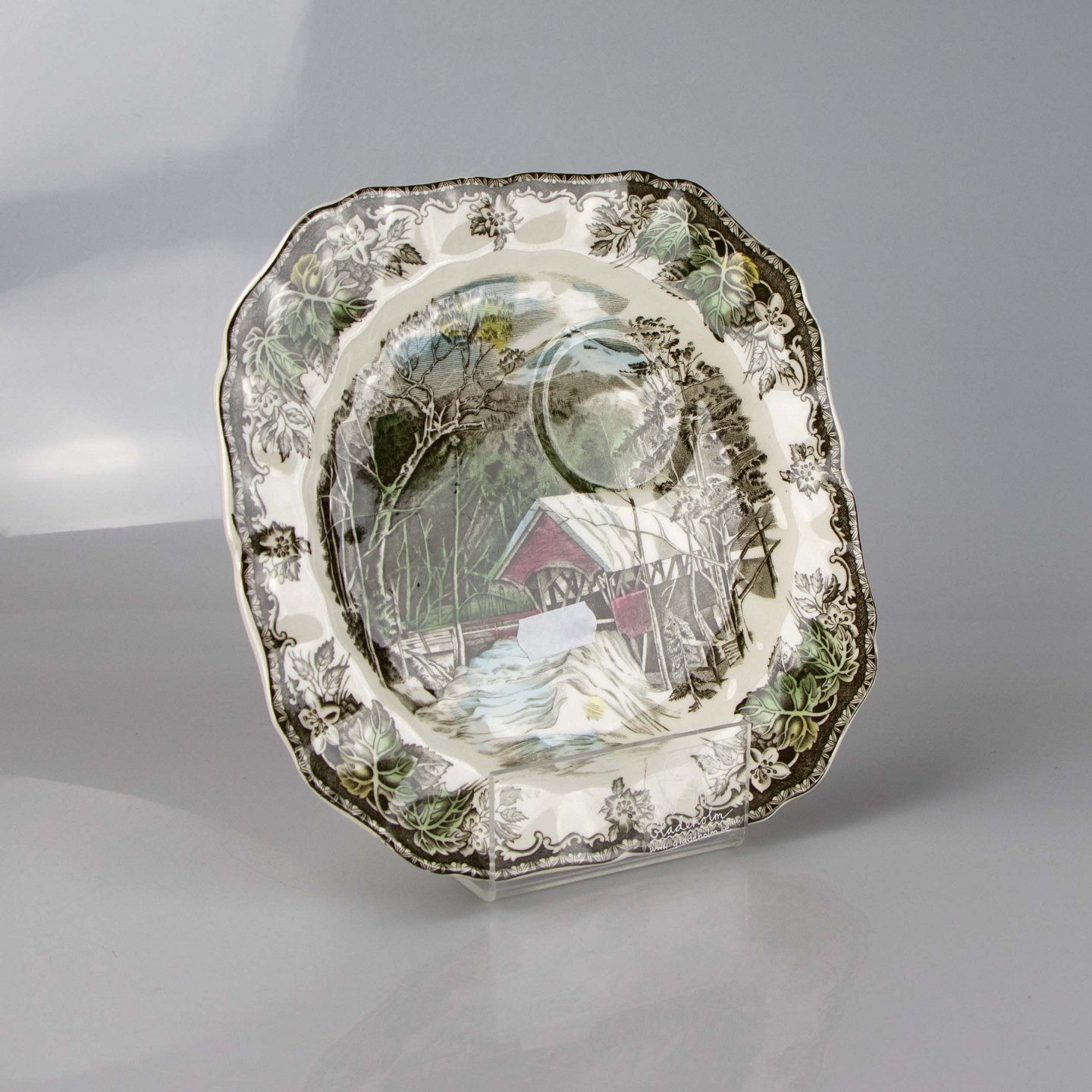 Kop og tallerken i lys fajance med multifarvet landsbymotiv af The covered bridge.