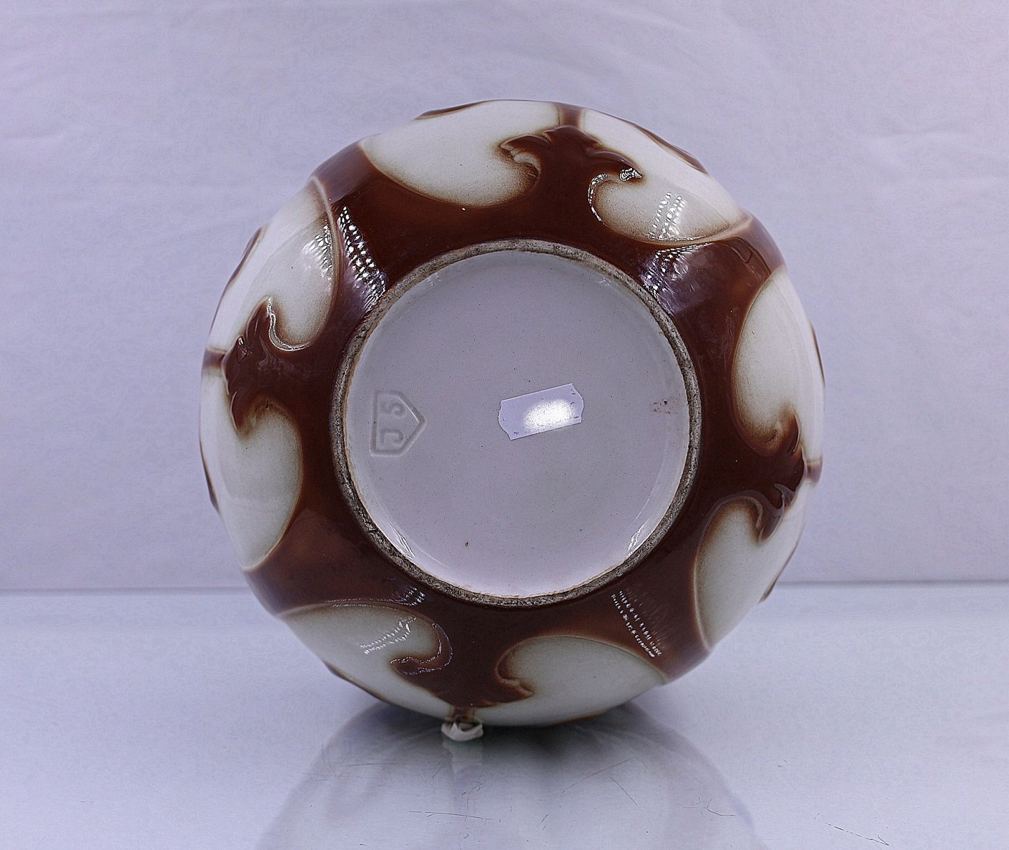 Majolica Fajance urtepotteskjuler, mede brunt stregmønster og blå blomster