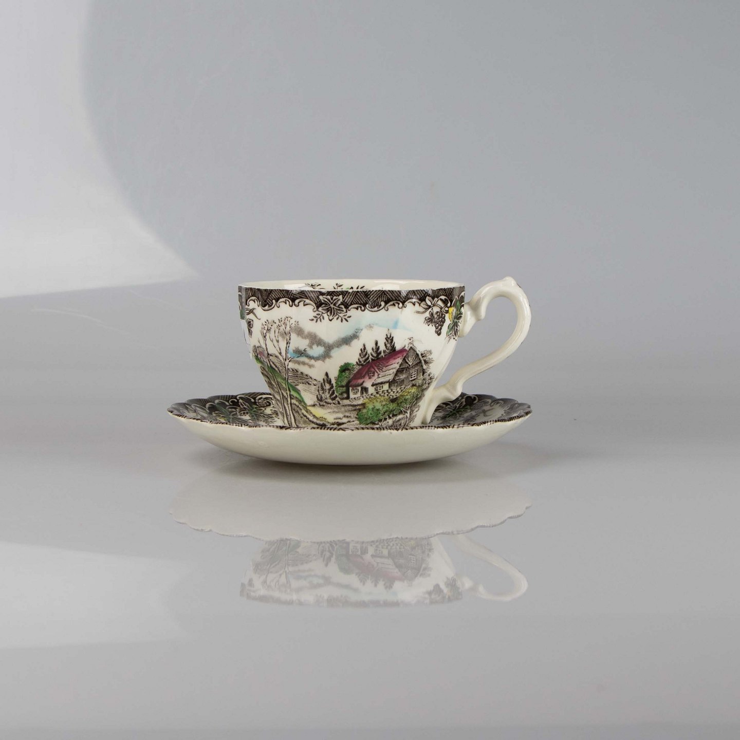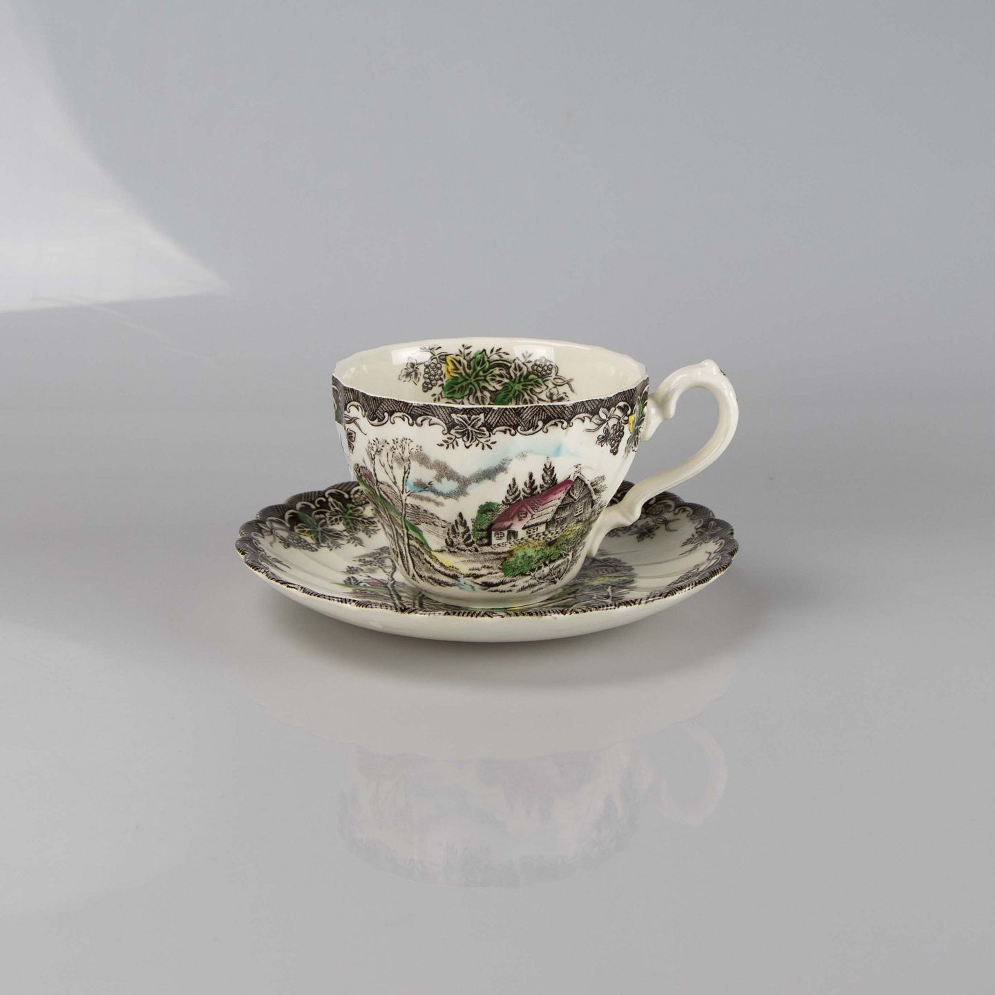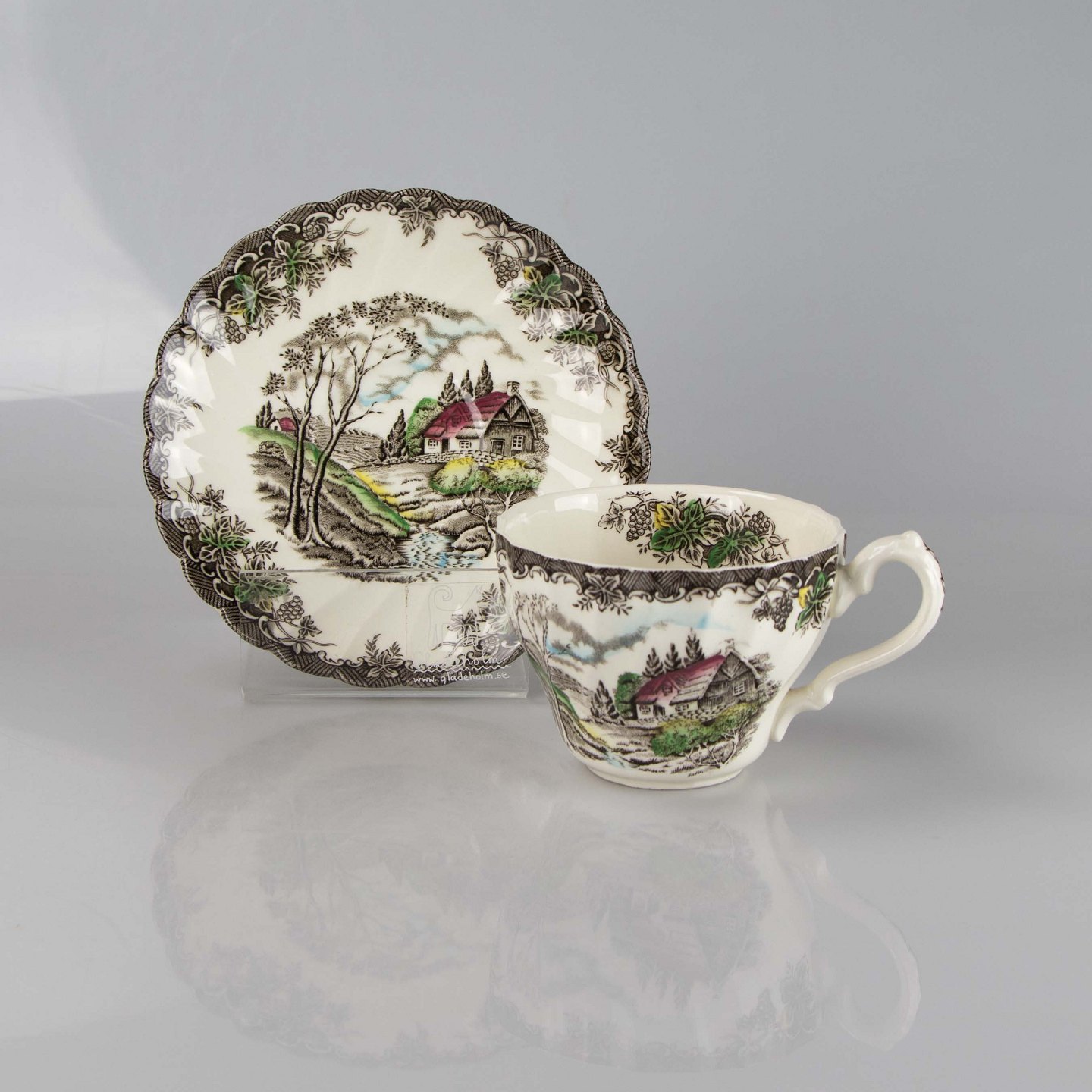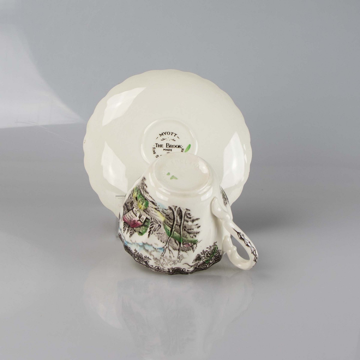 Kop med underkop i engelsk fajance fra stellet The Brook