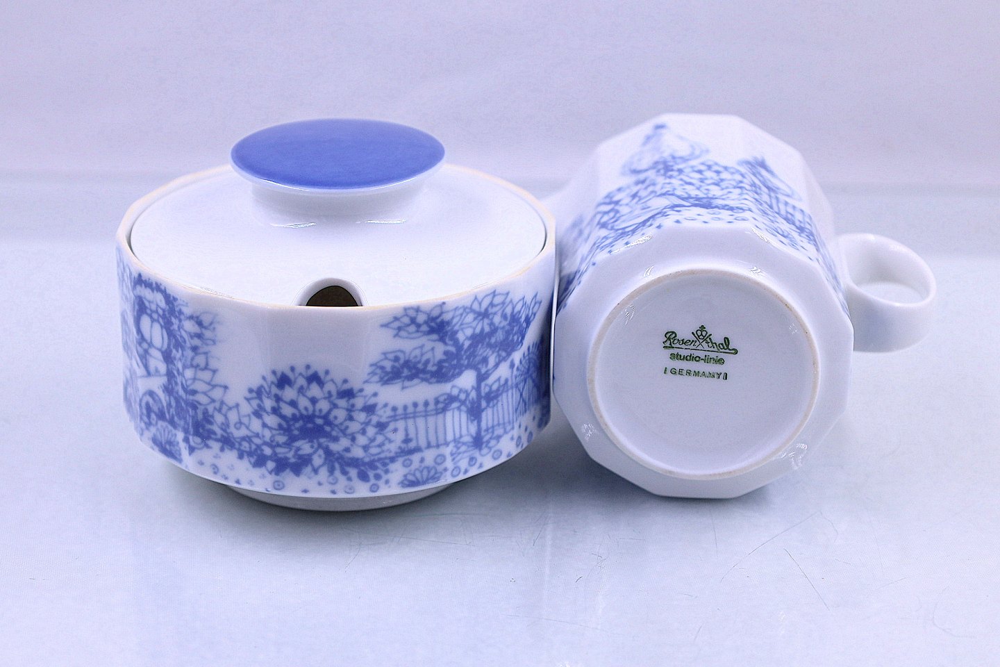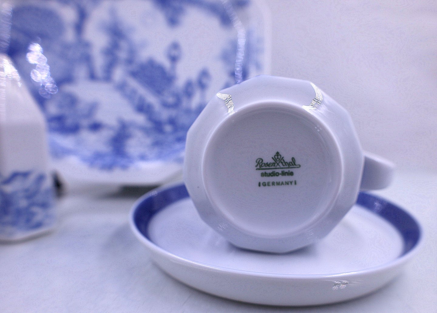 Rosenthal, Studio-Line, Germany. 9 sæt kopper inkl. desserttallerken, sukker+fløde, og salt/pebersæt, det hele koster 1500,00kr. Kaffestellet er hvidt med blå streg tegninger.