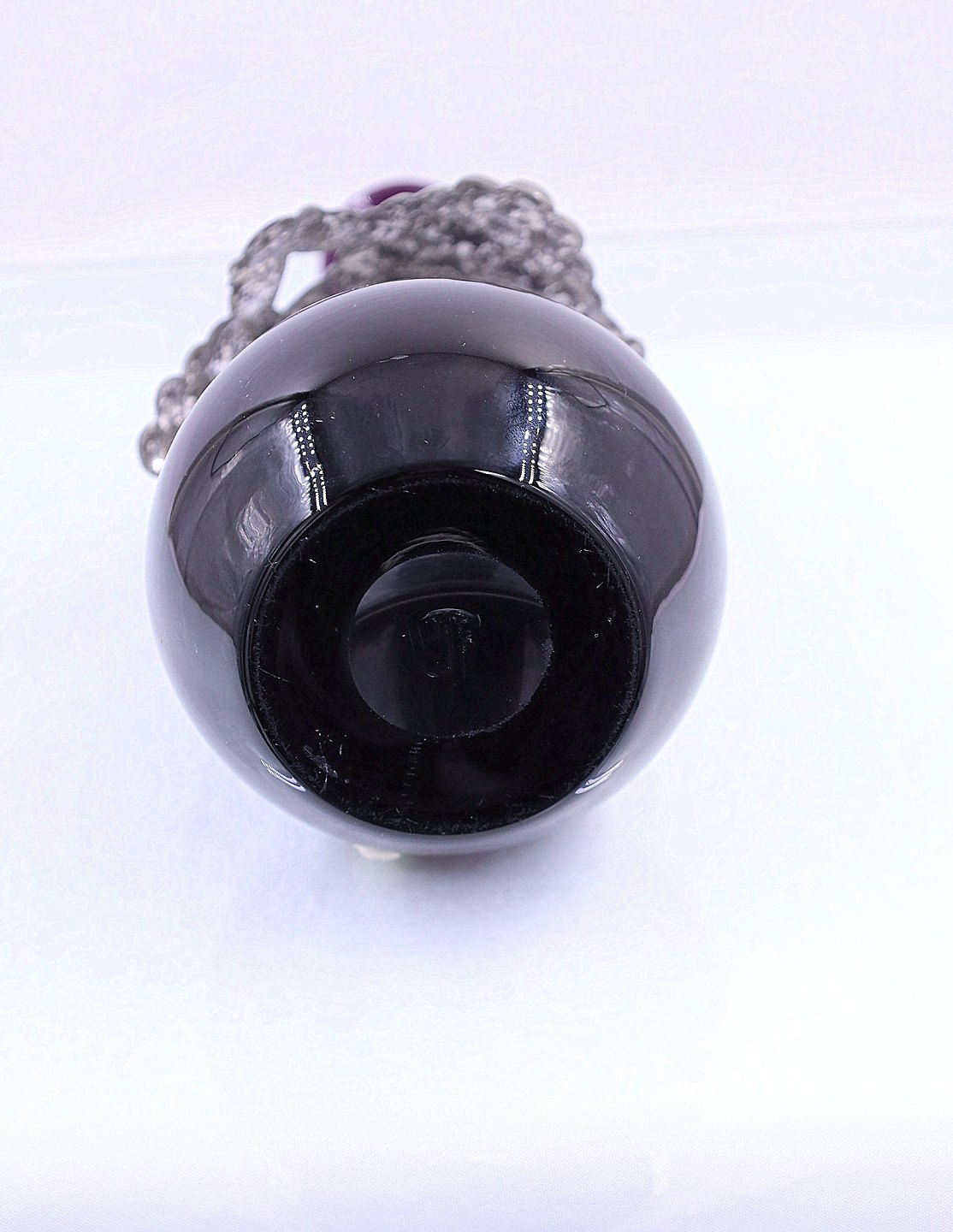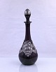 Glaskaraffel med tin krave og tin på proppen. Flasken har farven mørk bordeaux. Der er ingen brugsspor på karaflen