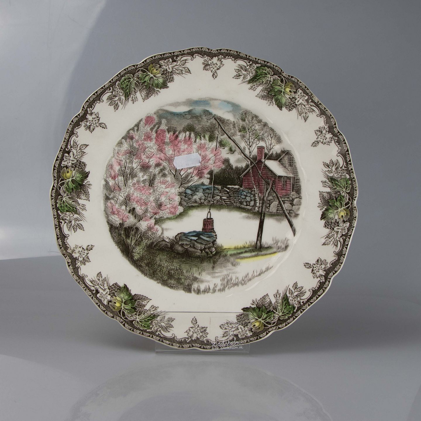 Tallerken i lys fajance med multifarvet landsbymotiv af The well.