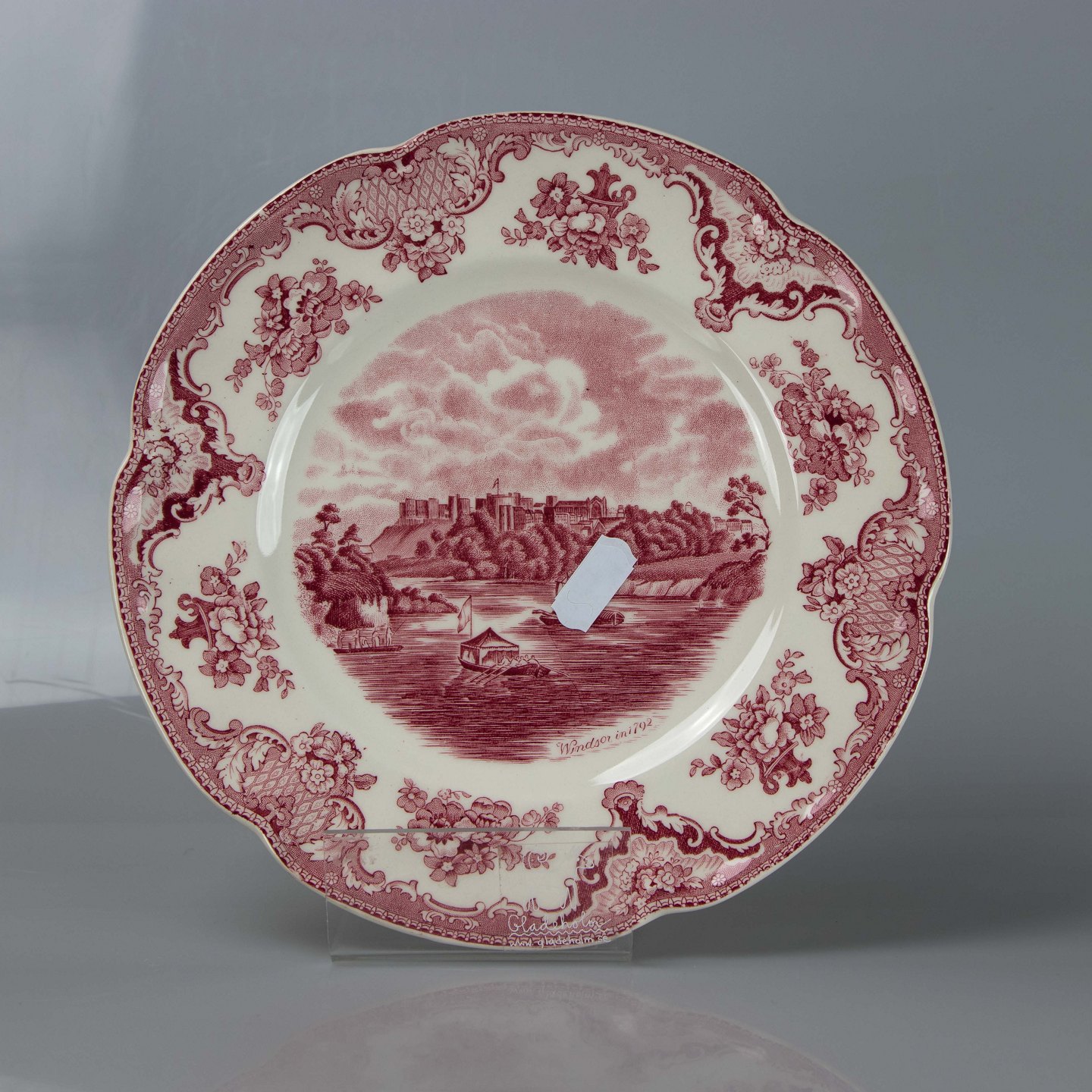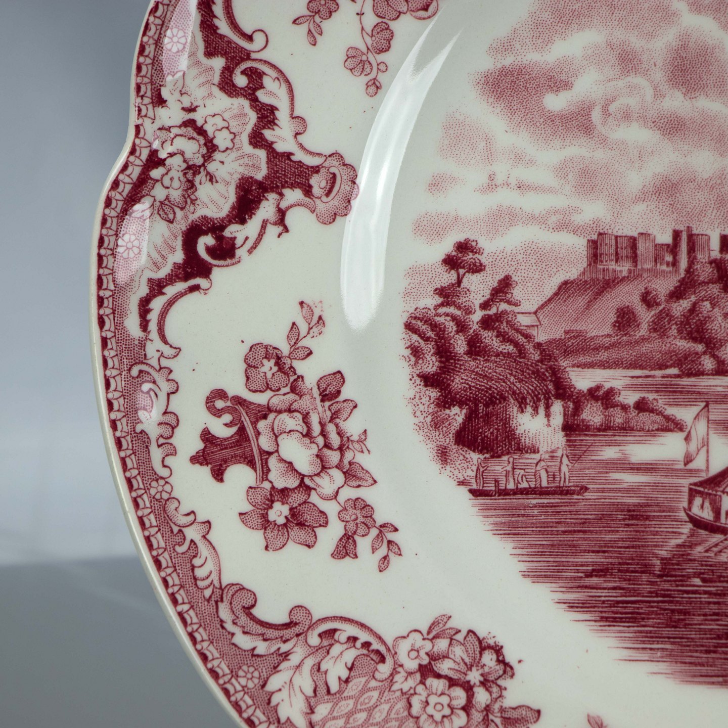 Tallerken i lys fajance med røddekoreret slotsmotiv.