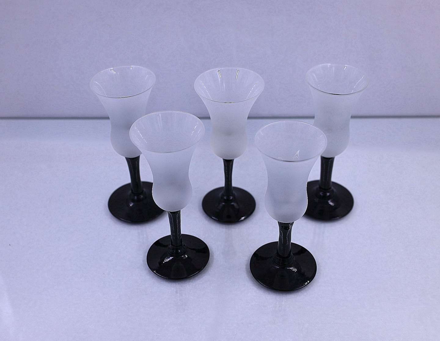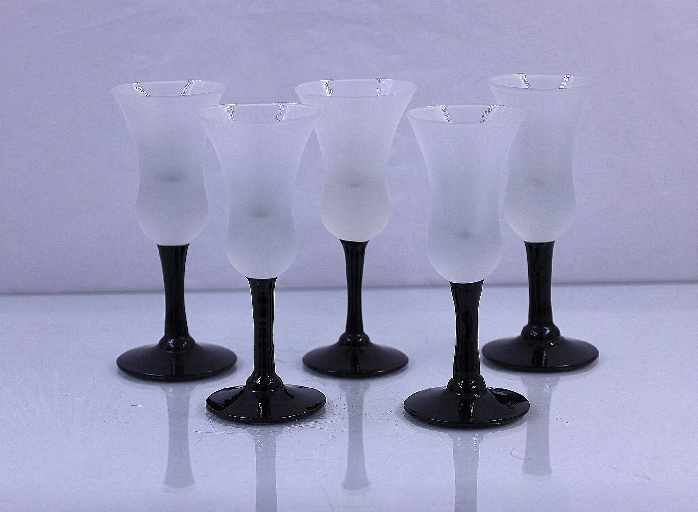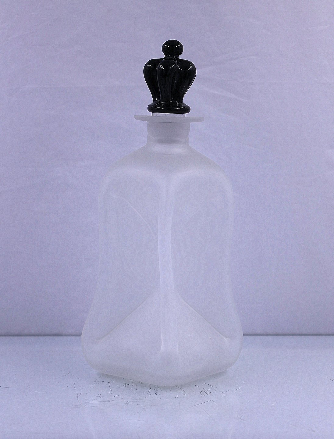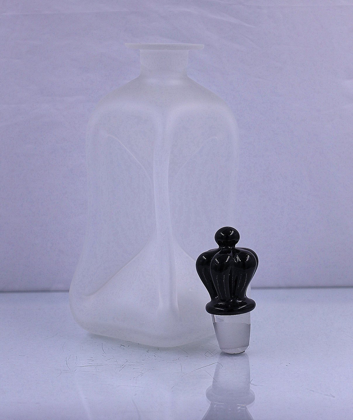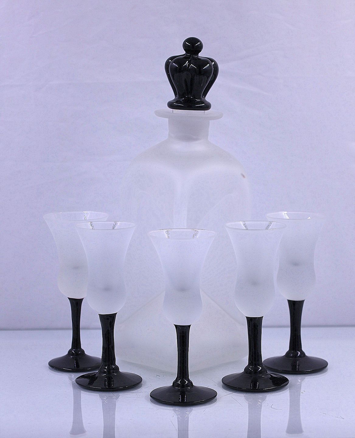 Holmegaard Glasværk. Viol Klukflaske med 5 snapseglas, klukflasken og glassene er sandblæste, glassene er med sort stilk og flasken er med sort kongeprop