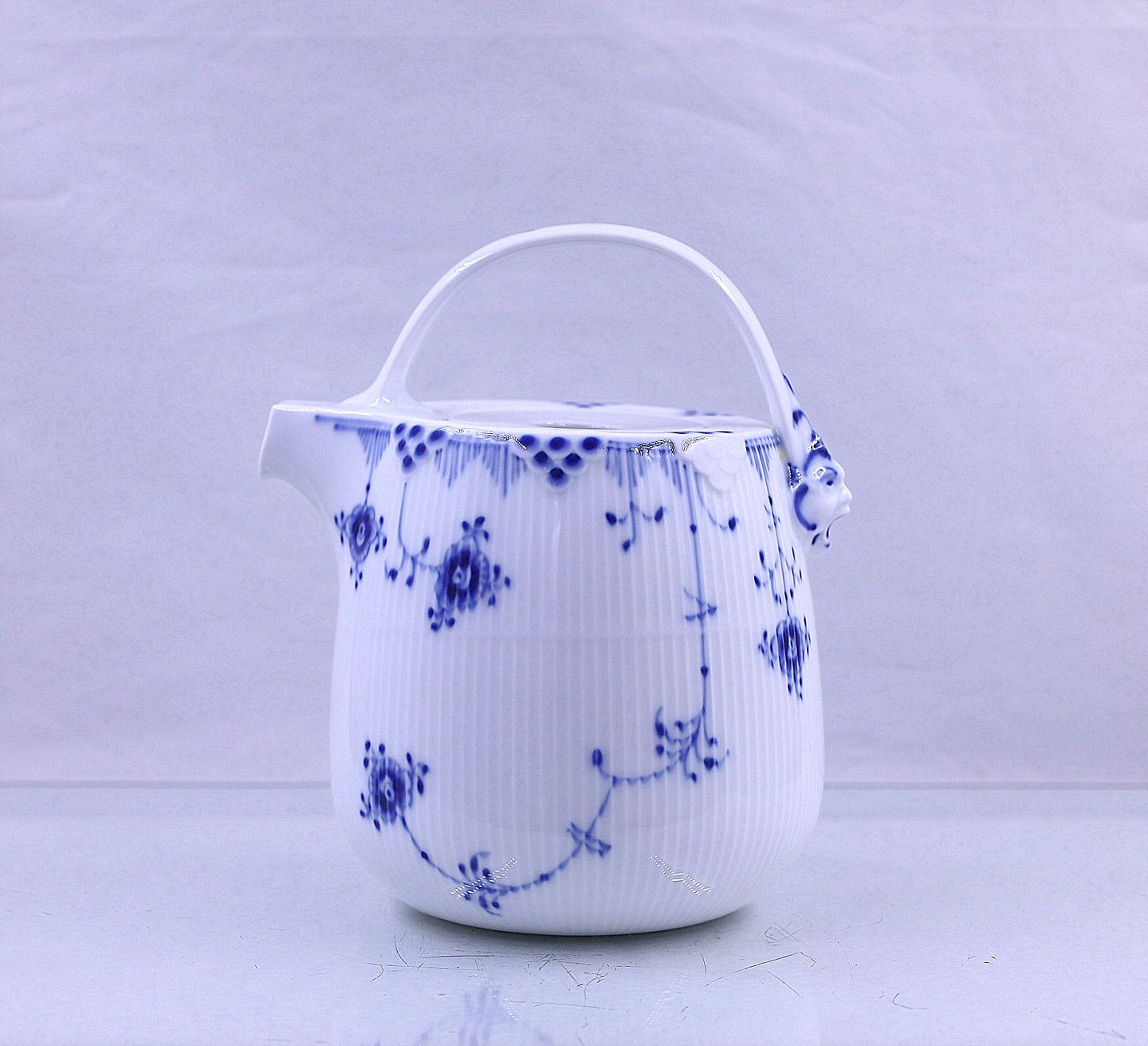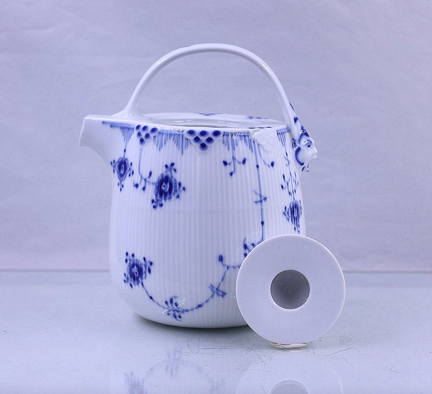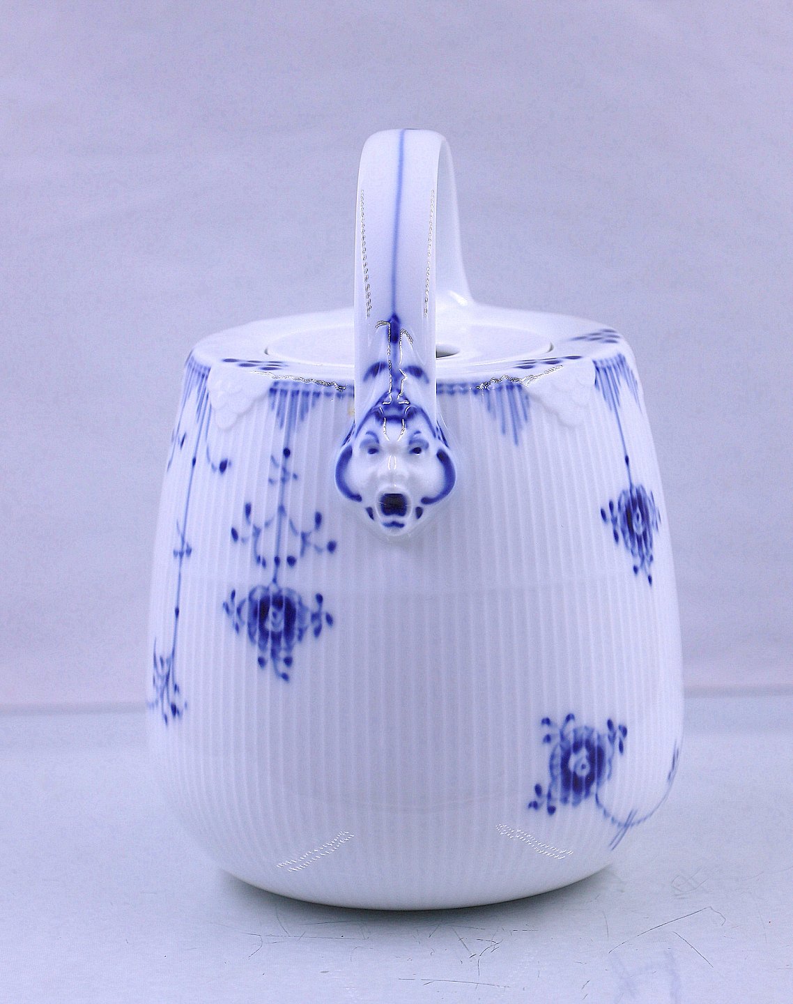 Som en lille detalje er hanken udsmykket med en dekorativ grotesk, som også er kendt fra Royal Copenhagens originale stel. På indersiden af låget er der en dekorativ snegl, som gør det nemt at tage tekandens låg af og på.