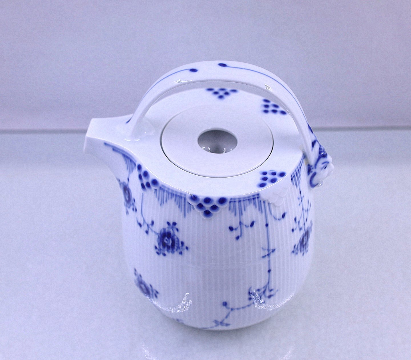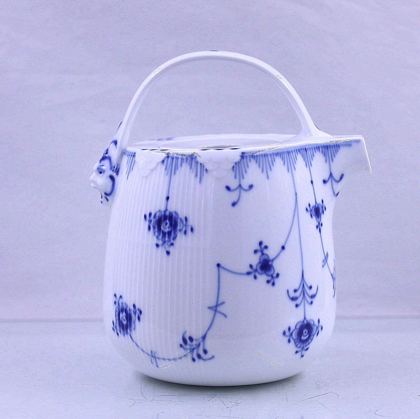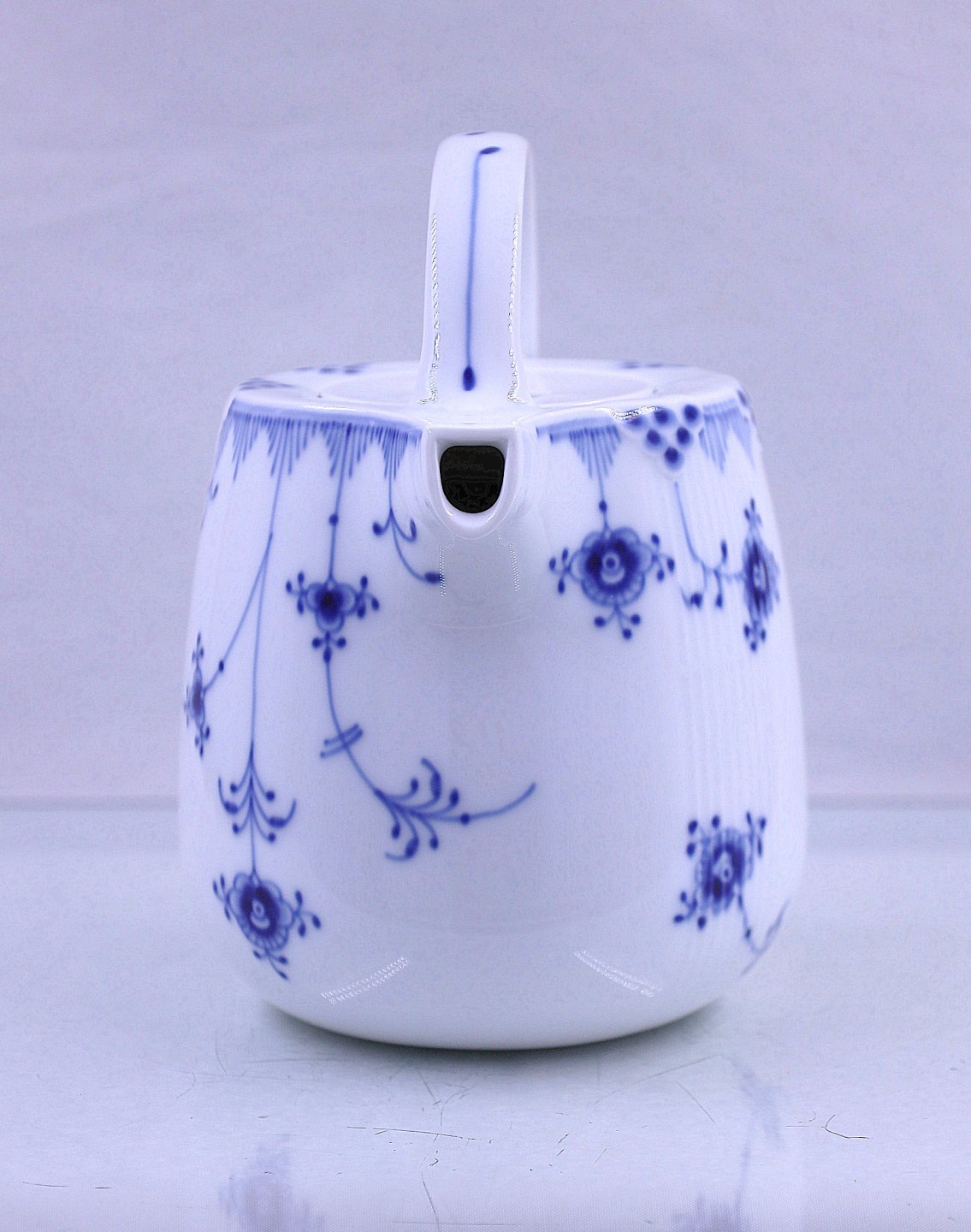 Som en lille detalje er hanken udsmykket med en dekorativ grotesk, som også er kendt fra Royal Copenhagens originale stel. På indersiden af låget er der en dekorativ snegl, som gør det nemt at tage tekandens låg af og på.