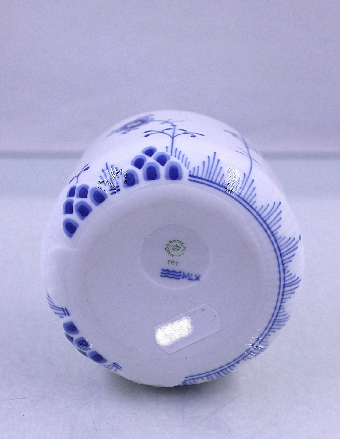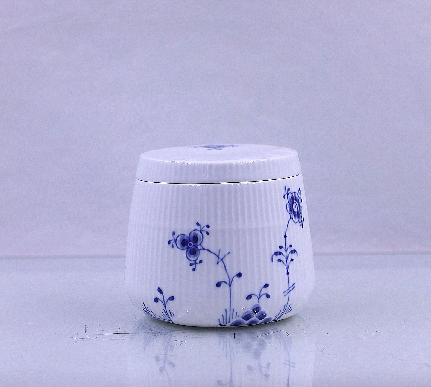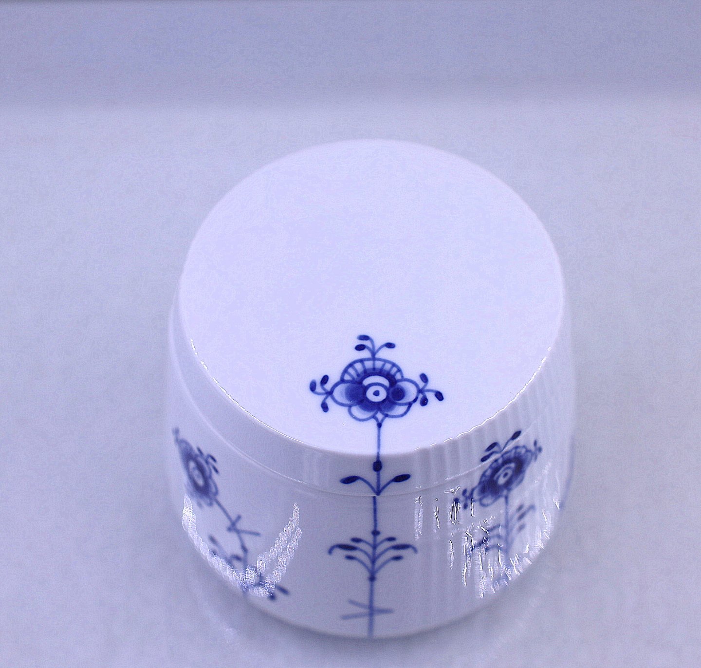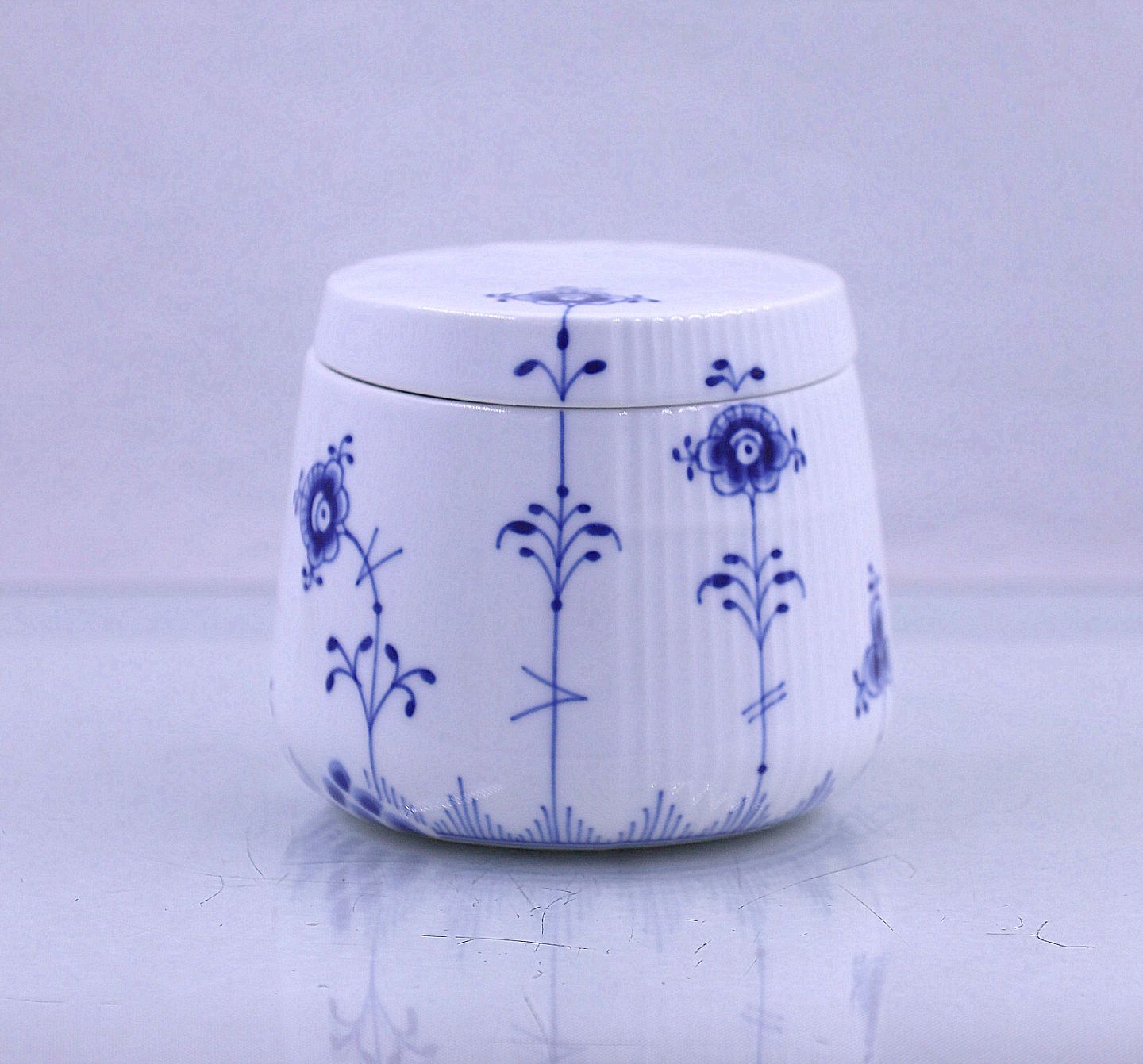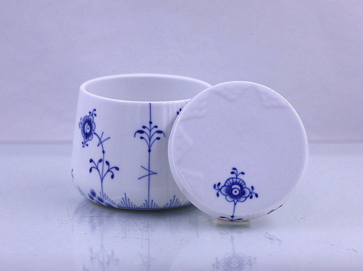 Royal Copenhagen. Blå Elements, skål nr. 161, med låg nr.160. låget passer til skålen i en enkelt blomst, der viser hvordan låget skal sidde.