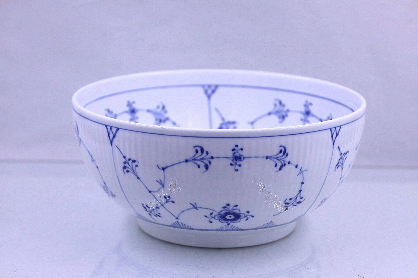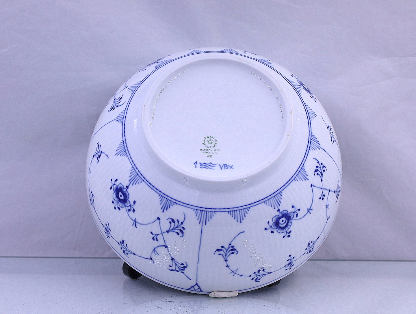 Royal Copenhagen. Musselmalet, riflet skål nr. 457, i de klassiske hvide og blå farver, håndmalet porcelæn